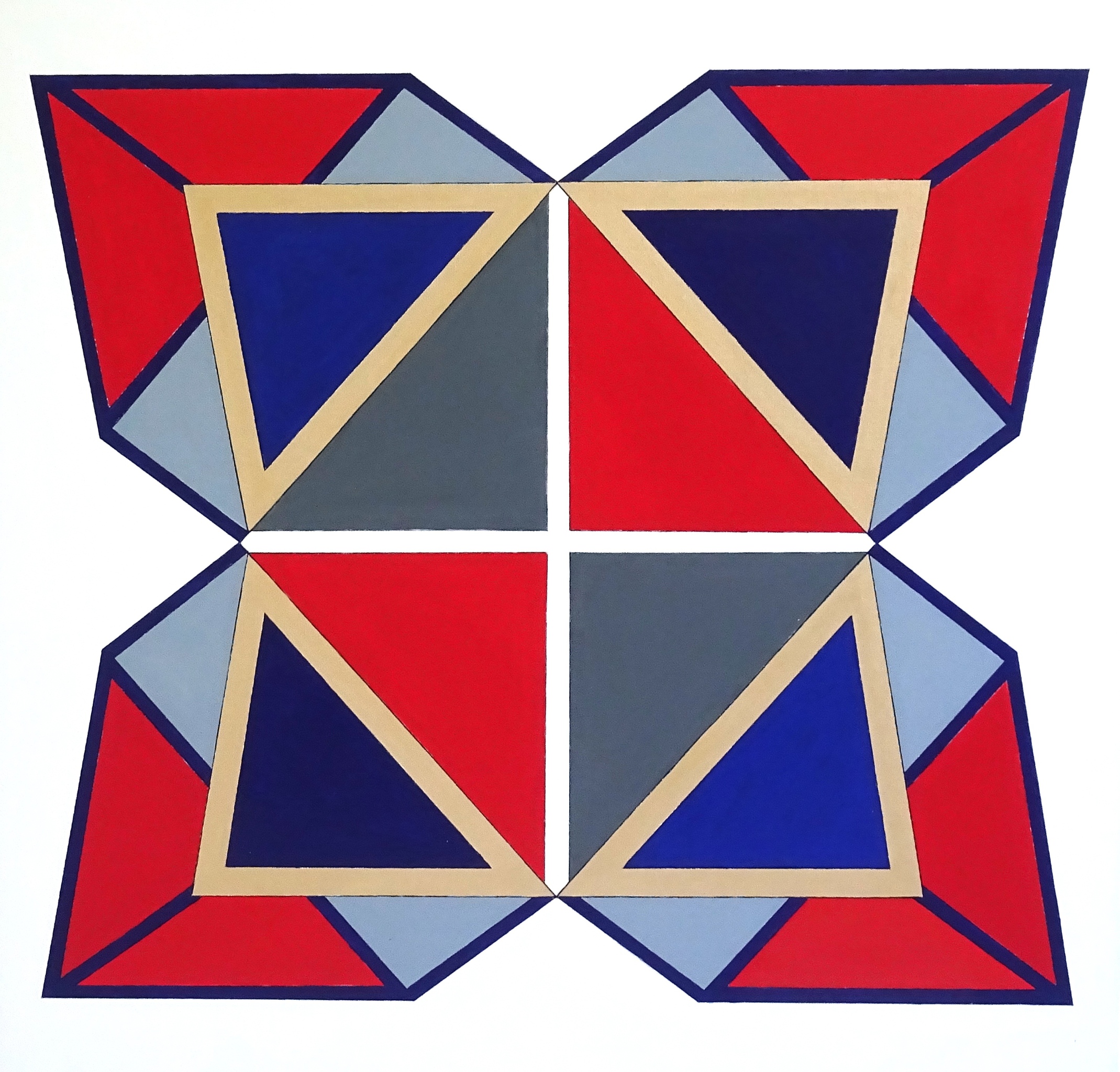 Geoglief. Driehoekscompositie van onregelmatige driehoeken . Als u naar het middelpunt blijft kijken ziet u het werk veranderen.[Geëxposeerd bij galerie Bos Fine Art Utrecht, gevestigd in de modelwoning van Gerrit Rietveld]