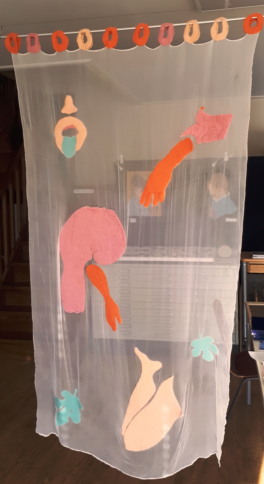 Chiffon zijden lap met (dubbelzijdig) natgevilten voorstellingen van delen van vrouwenlichaam.