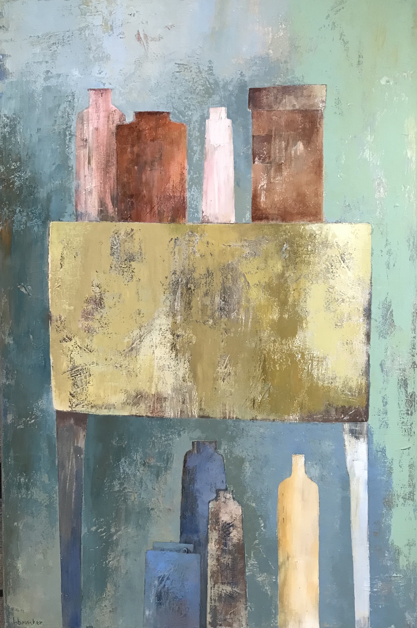 Wat betekent schilderen voor mij. Het is een uitdaging om het witte doek te temmen . Het met kleur bespelen , gebruikmakend van andere materialen zoals verband , krantenpapier , zand en druksels. Het begint met kleurlagen over elkaar , zodat de onderste lagen terug te vinden zijn in het uiteindelijke werk. Al doende ontwikkeld zich iets , het vormt zich , een beeld of gedachte wordt zichtbaar .