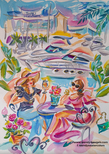 Old Watercolor Happy Village Algarve Bougainvillea Vilamoura
