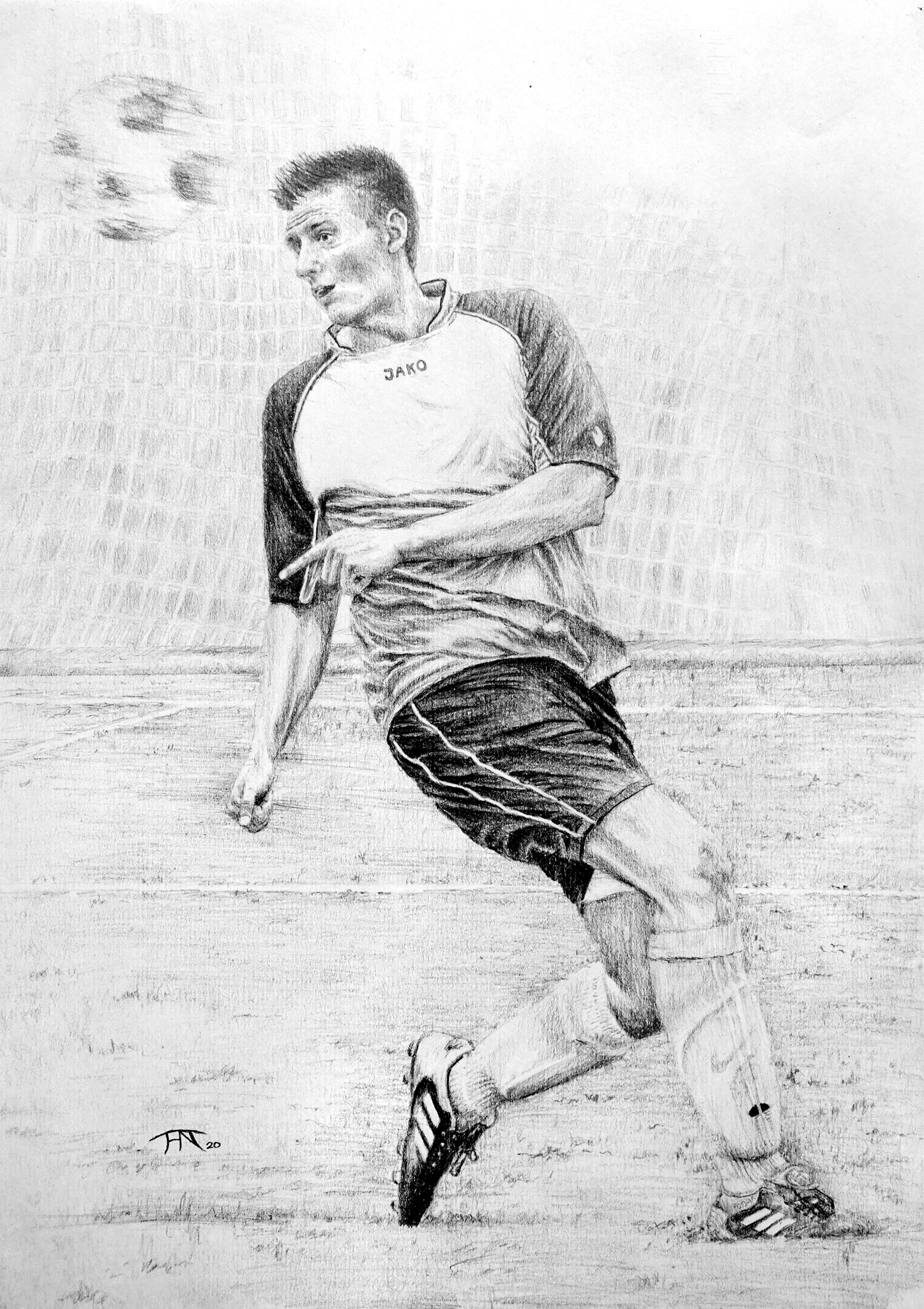 Mijn neef Rick Nennie speelt één van zijn laatste competiewedstrijden. Hij kopt naar links en zijn houding is in een mooie onbalans. In deze potloodtekening heb ik Rick daarom diagonaal getekend.