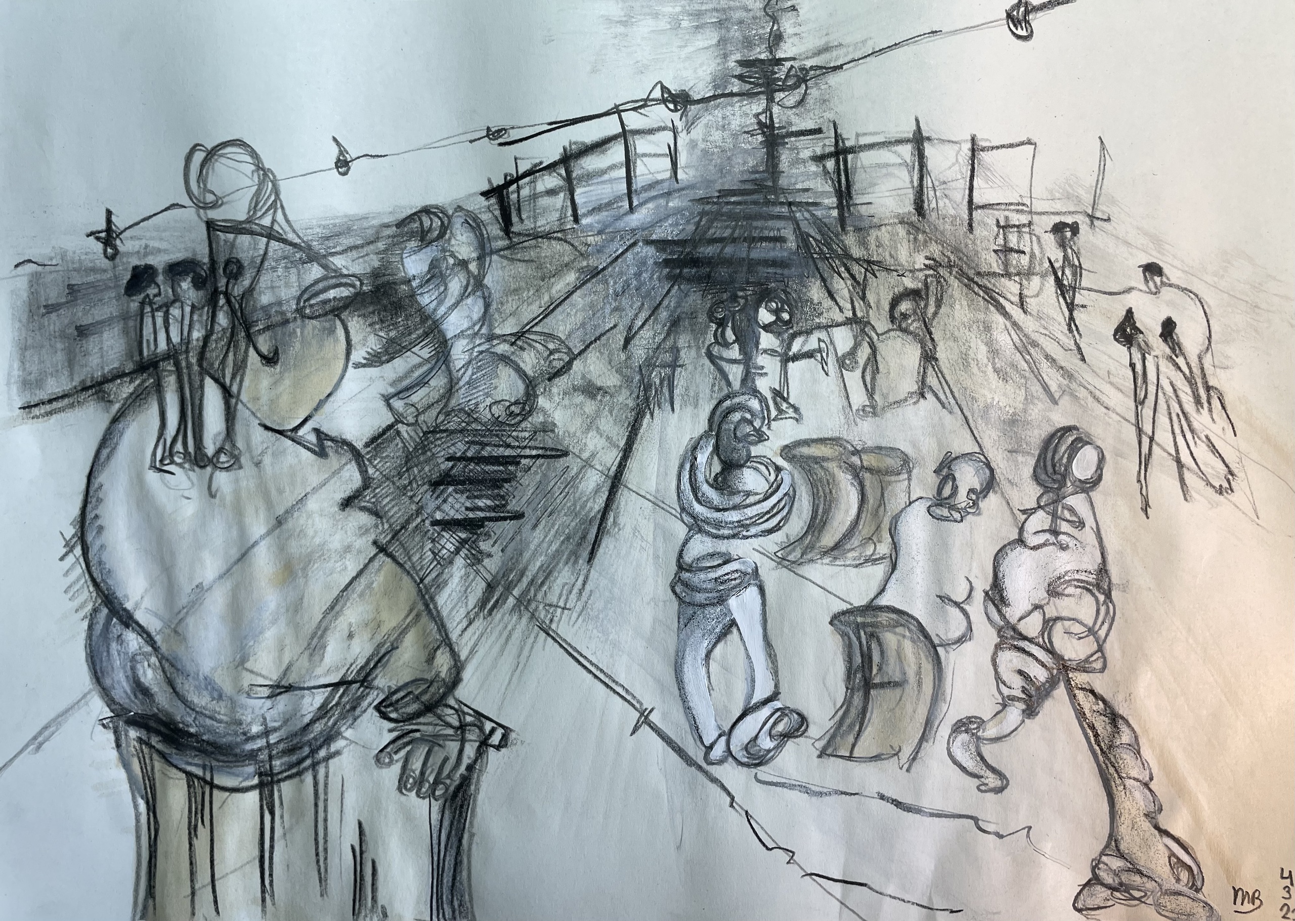 Mixed Media Papier Tekening Crowdscape