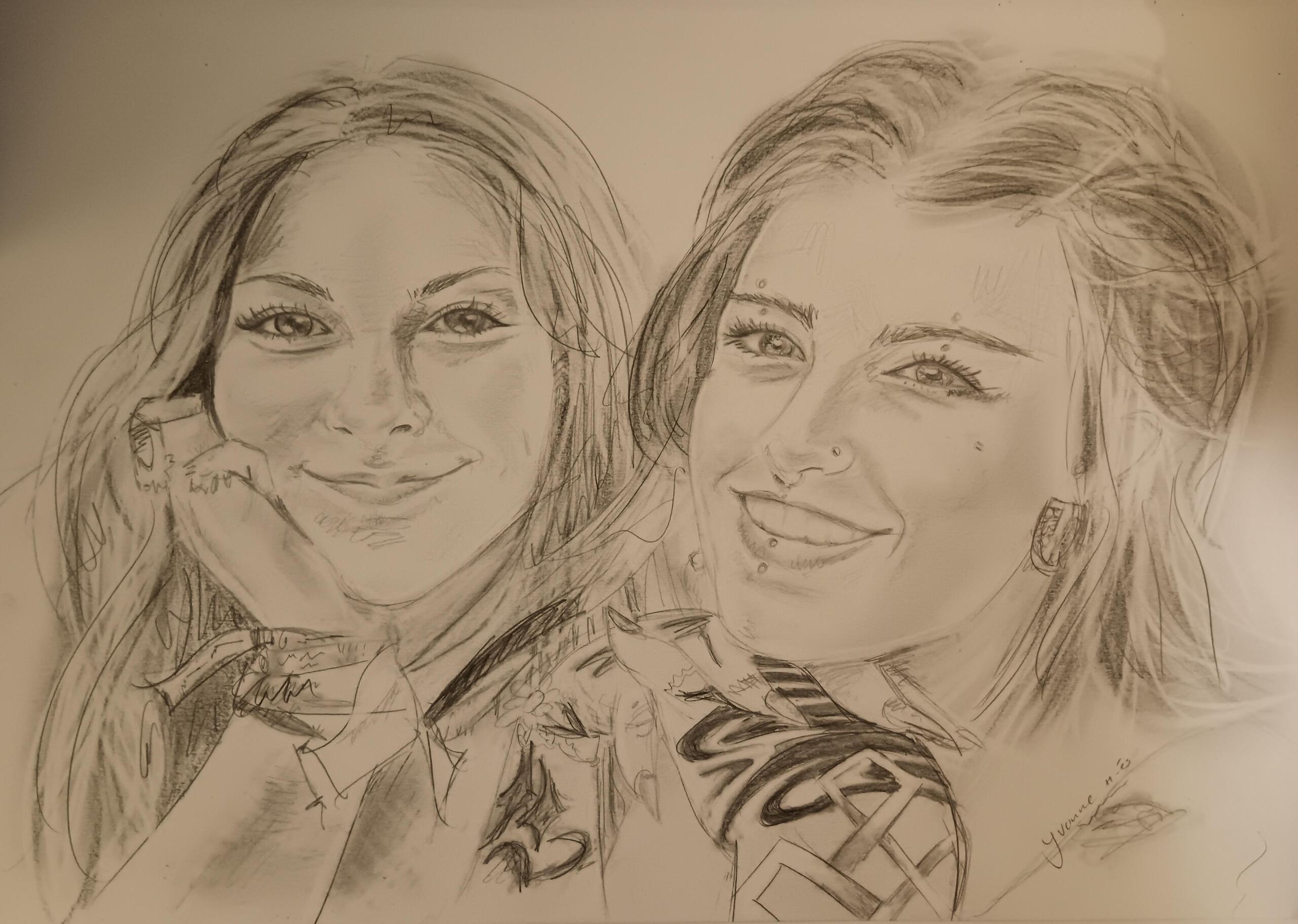 A3 160 gr, potlood HB, 2B, 3B. Snel, wat groffer portret van Sannah en Bibi
