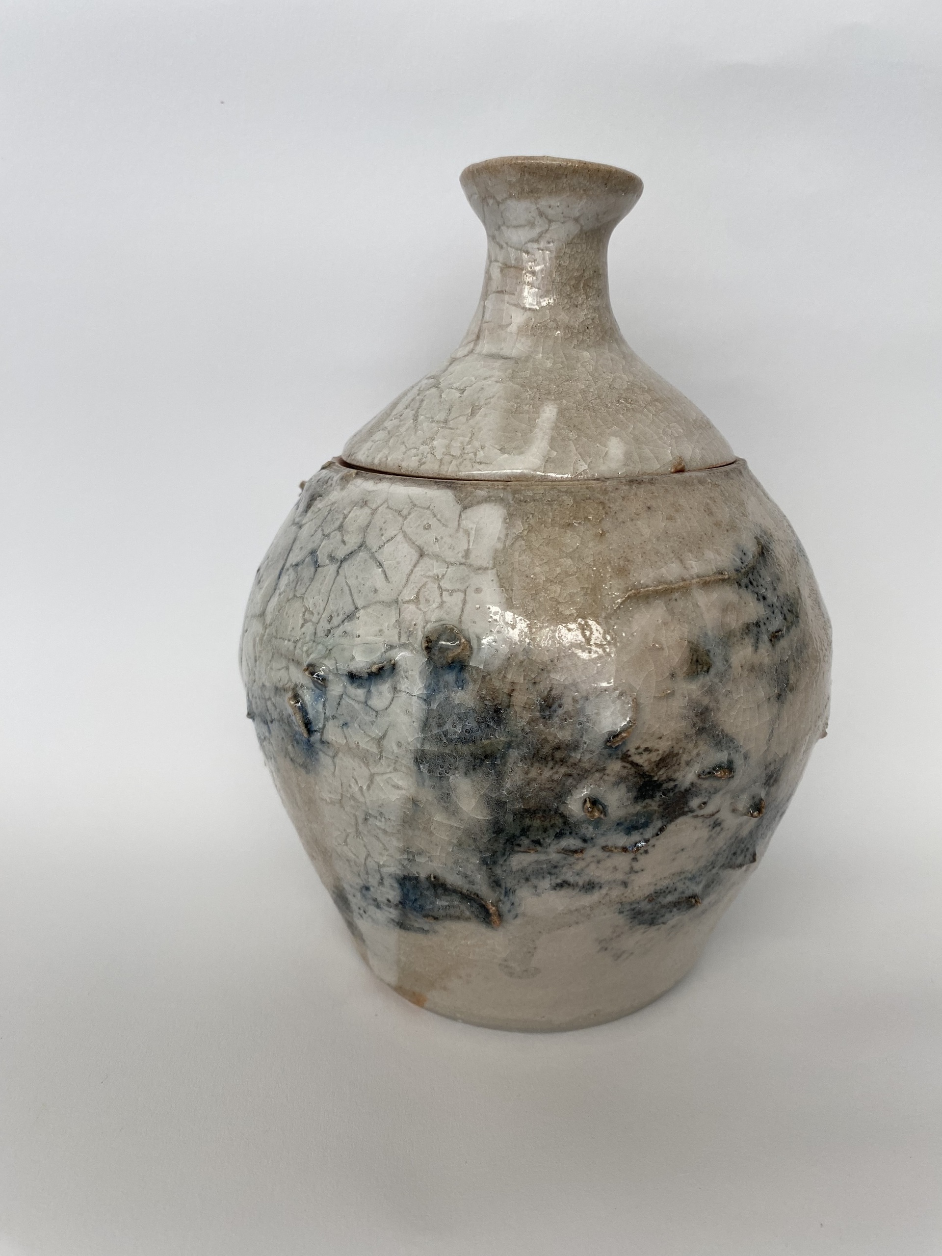 Deze dikke buik dekselpot is steengoed gebakken. Een vleugje zwart met ruwe uitsteeksel voor bijzondere licht inval. Voor de kenners een beetje shining, wat Malcolm en gosu😀 Resultaat- bijzondere dekselpot gedraaid op de draaischijf.Â