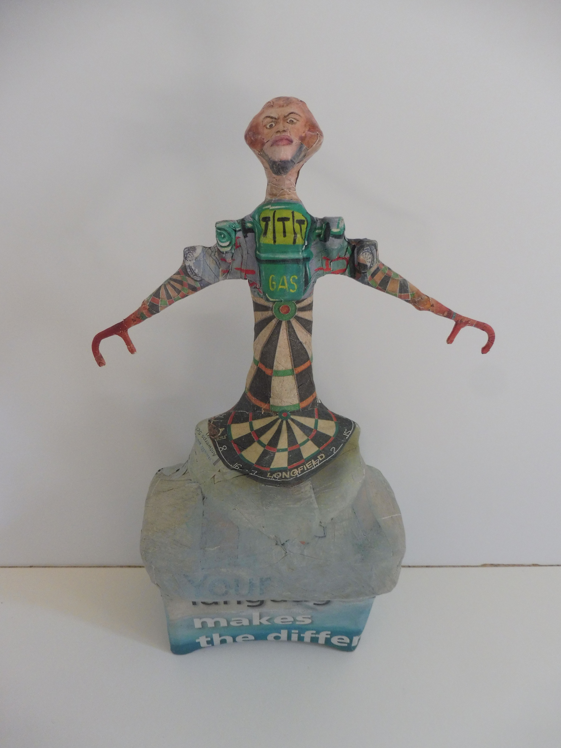 Ik heb eerst dit beeldhouwwerk gemaakt en vervolgens beplakt met collagemateriaal.