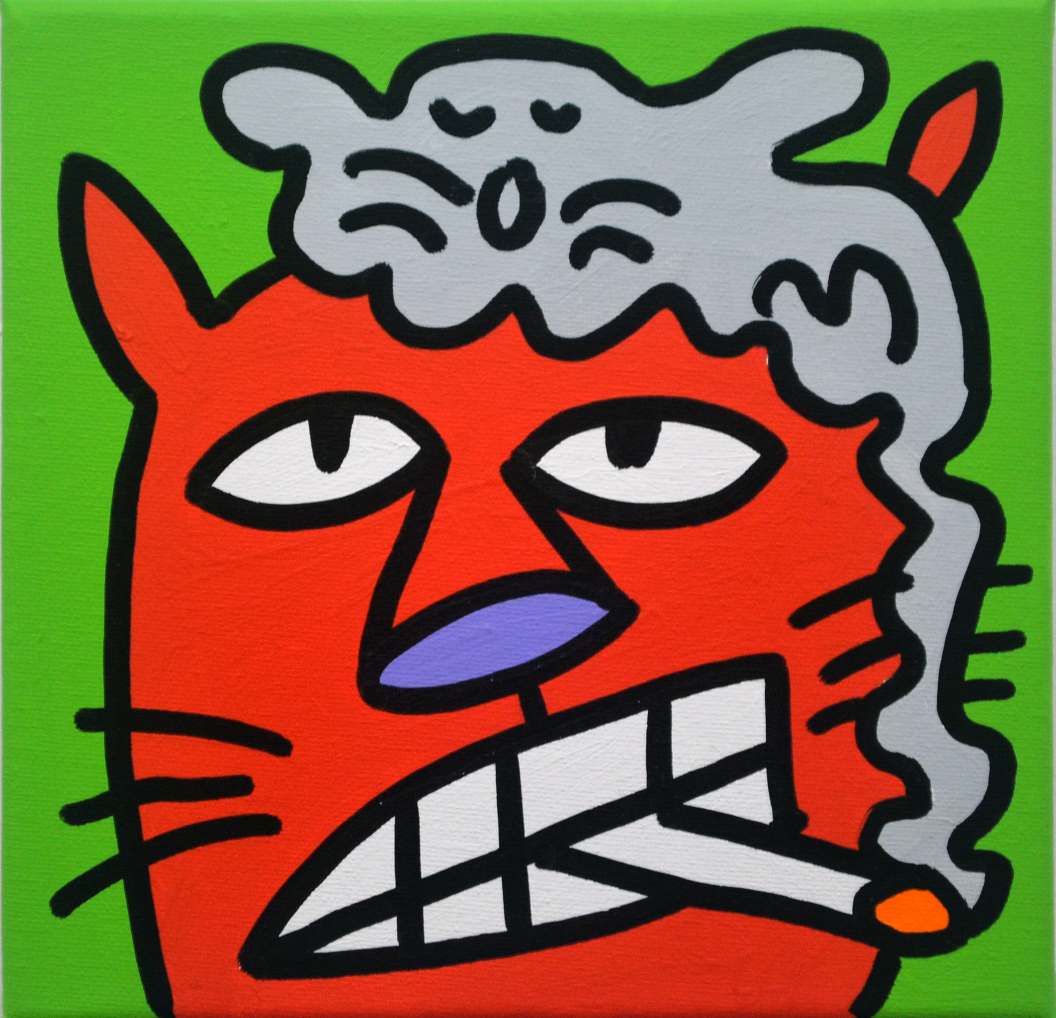Rokende kat met rook in de vorm van een muis. Cartoonachtige voorstelling. Dit werk is ook inclusief baklijst leverbaar.