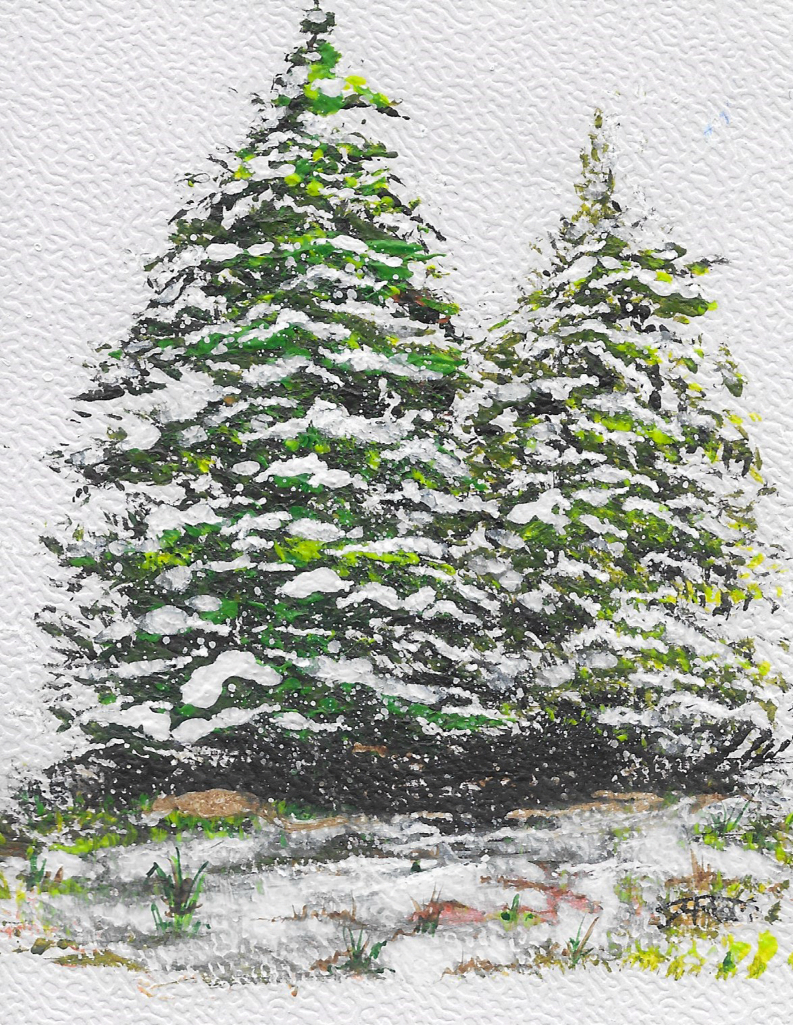 Leuke oefening voor het schilderen van bomen in de sneeuw. Het eenvoudige schilderijtje kan als kerstkaart gebruikt worden.