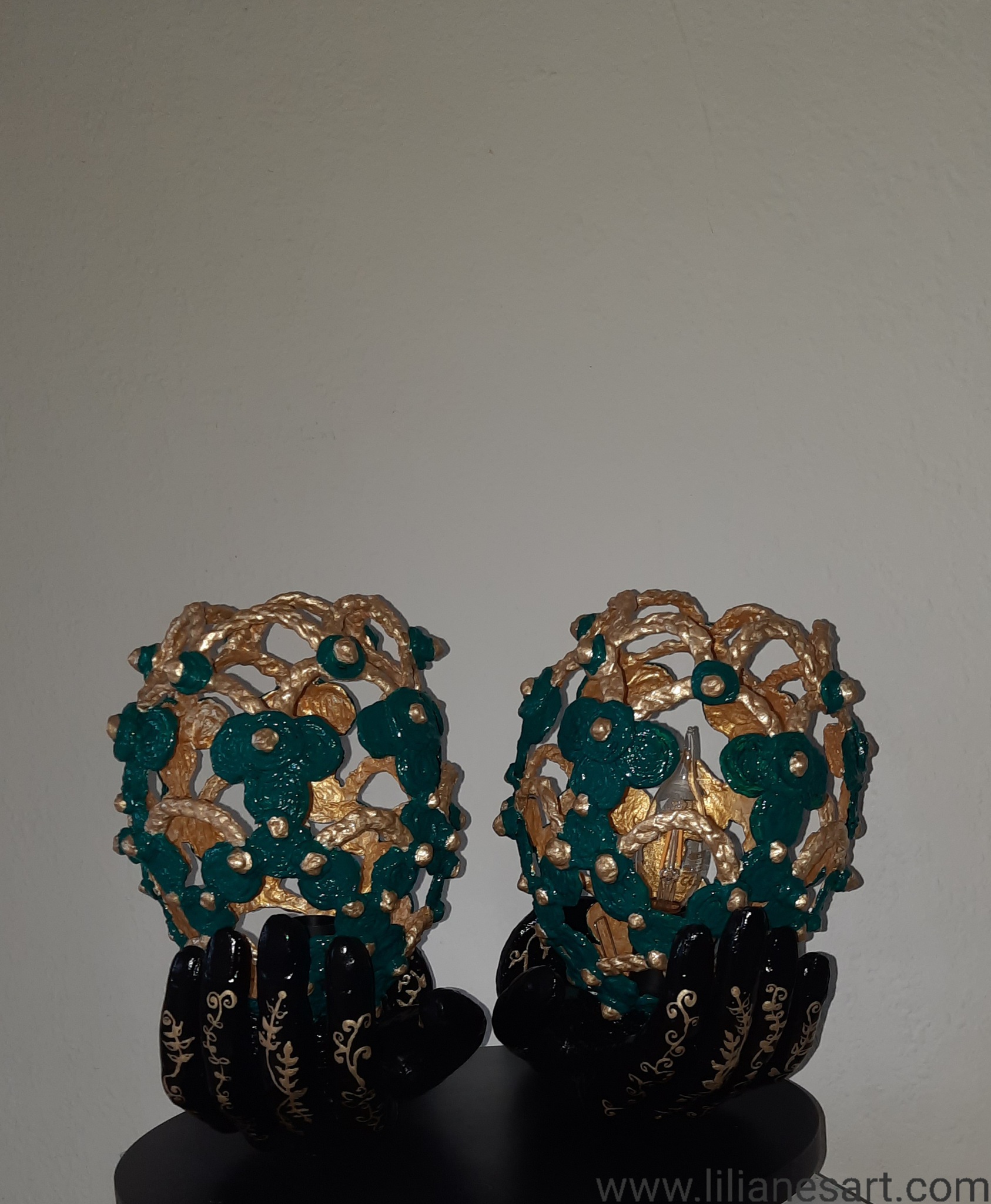 Wandlampen handen Art Nouveau stijl. Kan op twee verschillende wijze worden opgehangen. Het zijn een rechter en linkerhand. De handen zijn beschilderd en sommige afbeeldingen zijn symbolisch. De afmetingen zijn circa.