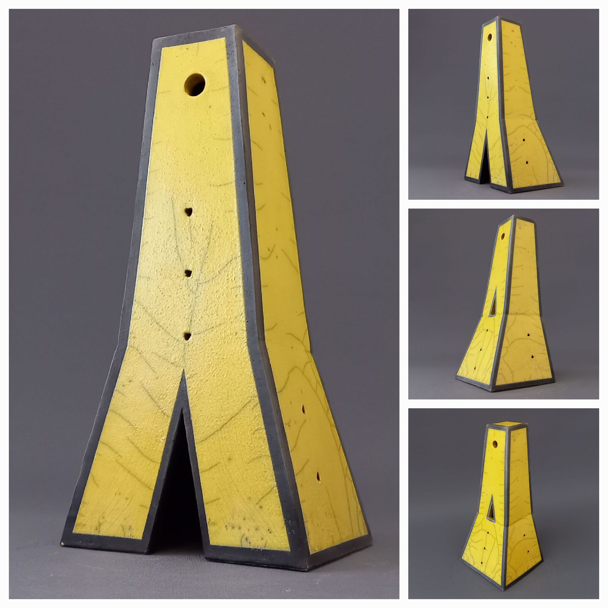 Trapezium-vormige kapel. Raku gestookt met een geel, transparant, glazuur