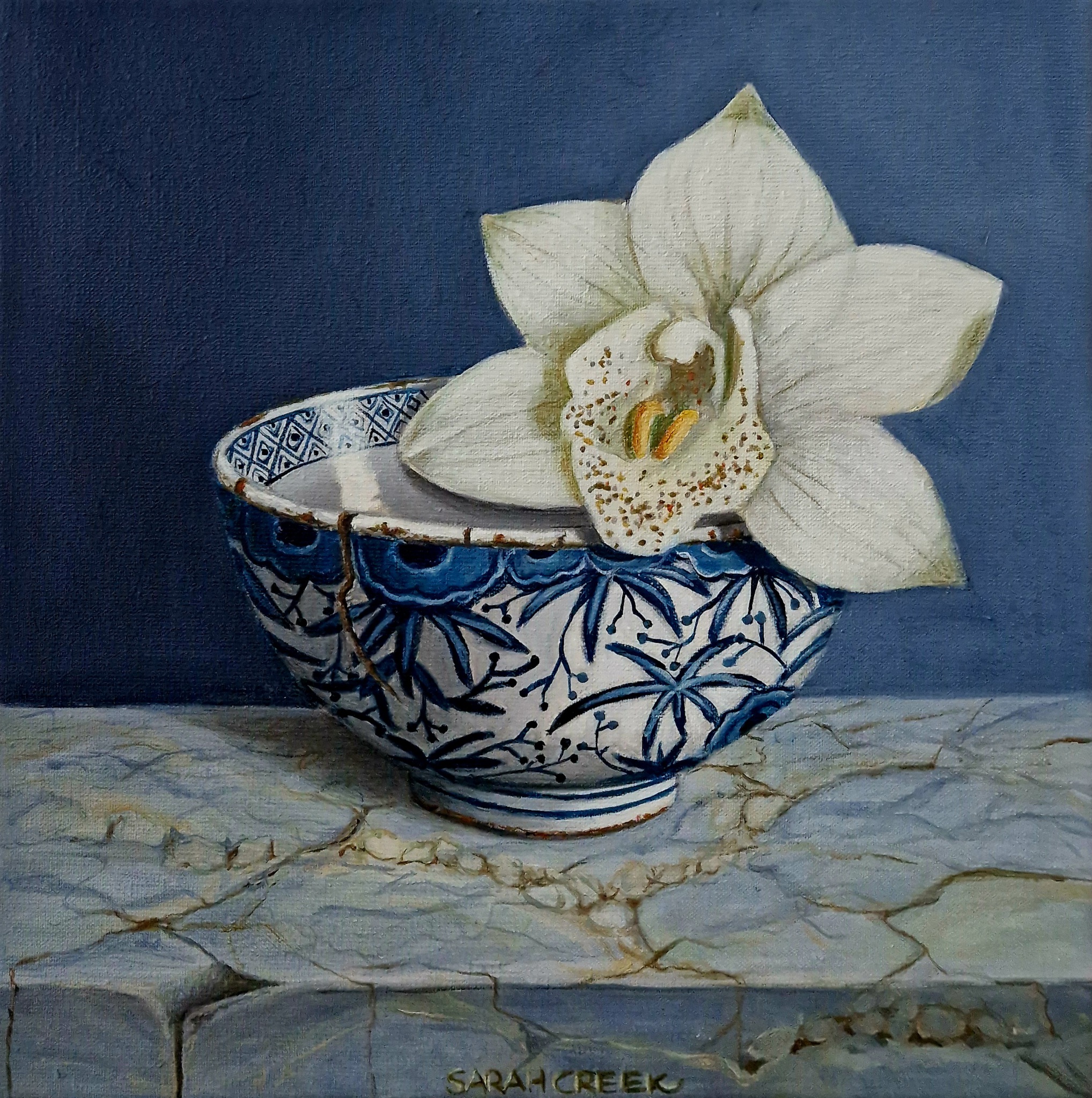 Sarah Creek schildert met acryl op canvas of linnen. Onderwerpen zijn portretten en stillevens. Sarah geeft les aan 55 talentvolle cursisten in een atelier aan huis.