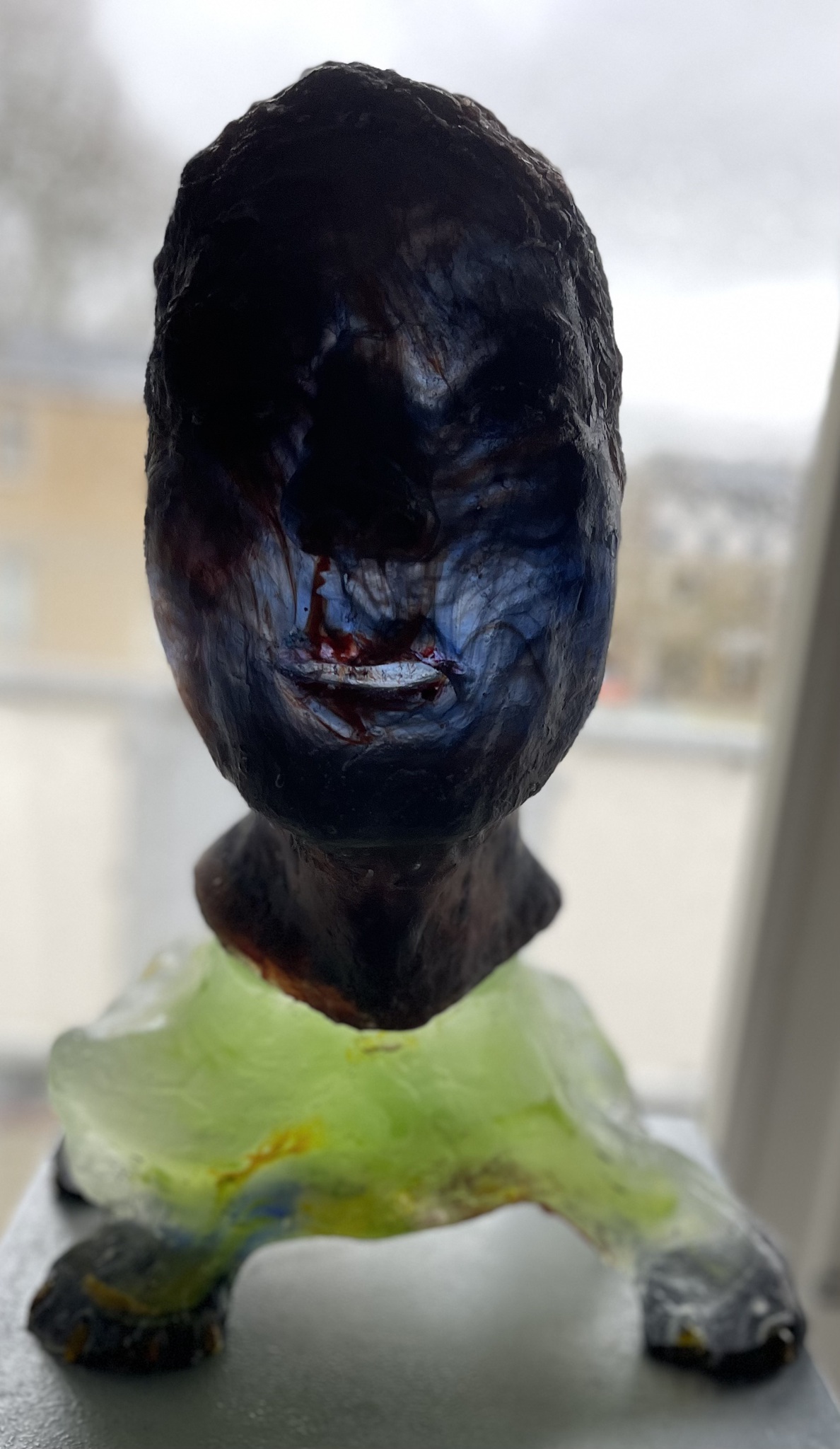 Combinatie van 2 werken, een gegoten abstract glaswerk met een soort leeuwenpoten met daarop een mensenlijk portret van zwart glas gemonteerd.