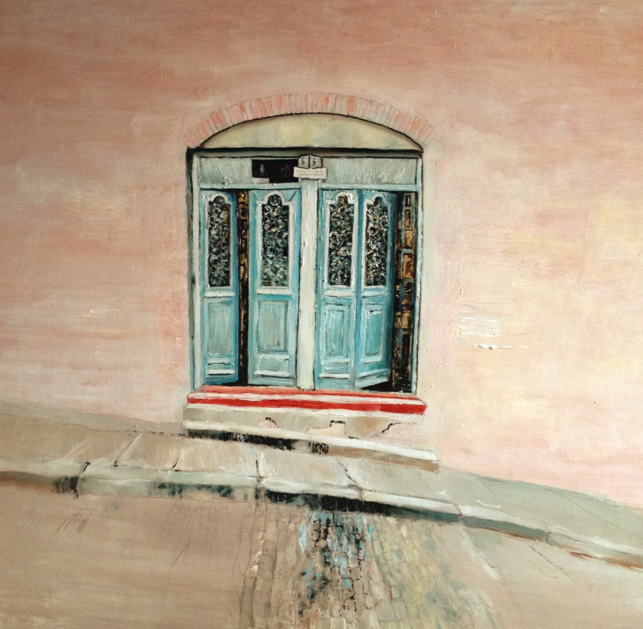 Dit schilderij is onderdeel van vier werken. Twee schilderijen met deuren (een naar lanks aflopend en een naar rechts aflopend), een klein schilderij met een spinx en een geschilderde houen boog met goudverf (oorpronkelijk onderdeel van een huis)