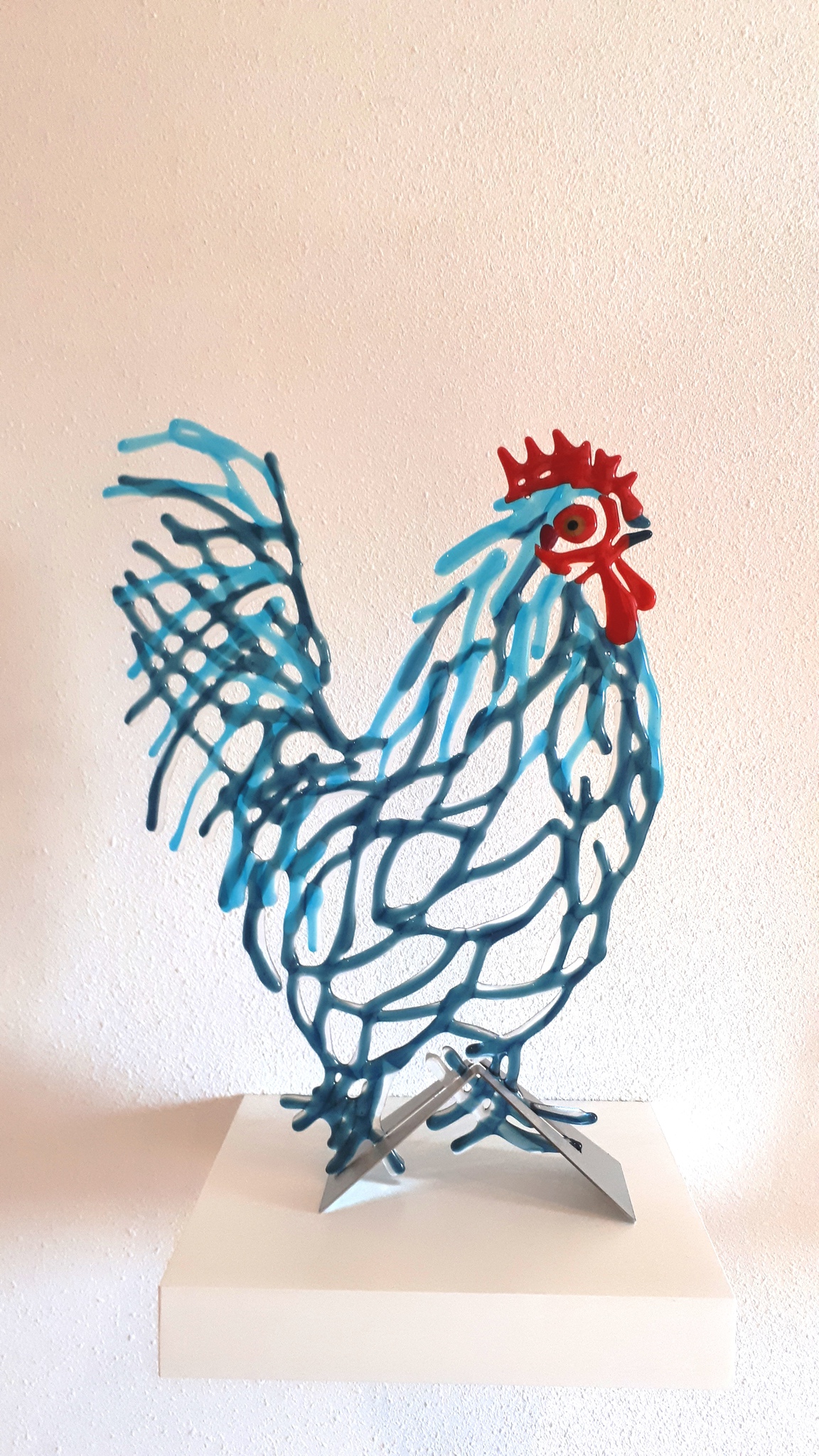 Op luchtige wijze in glas vormgegeven haan, blauw met turquoise glas en rode accenten.