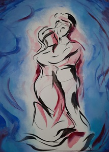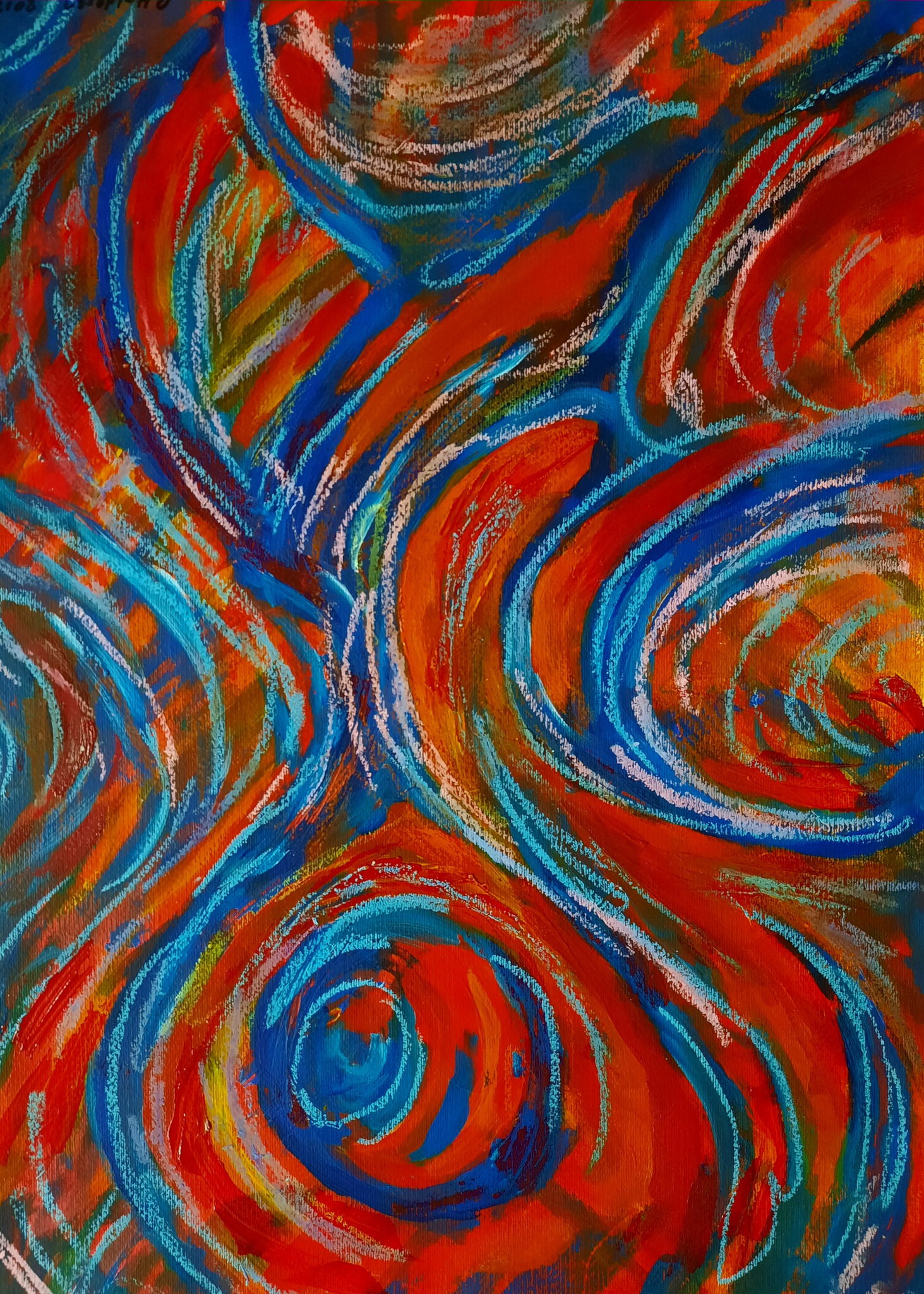 Dit schilderij maakte ik terwijl ik vol overgave luisterde naar Spaanse dansmuziek. Acrylverf en oliepastel.