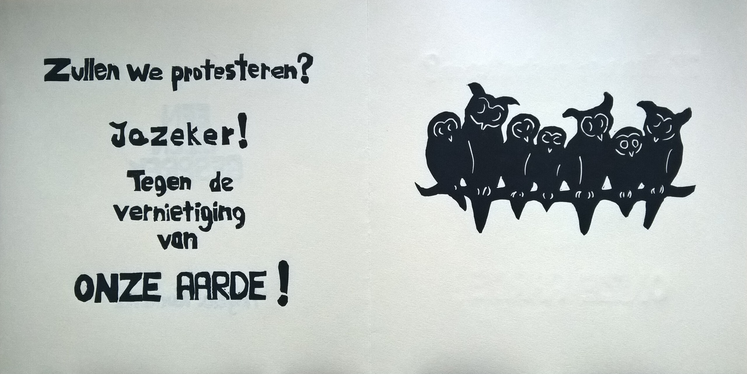'Een uilengesprek' werd gesneden en gedrukt voor de project 'Klaboem!', een project met als onderwerp 'protest', van Stichting Drukwerk in de Marge. Linoleumsnede gedrukt op 3 pagina's. Deze zijn pagina 2-3.