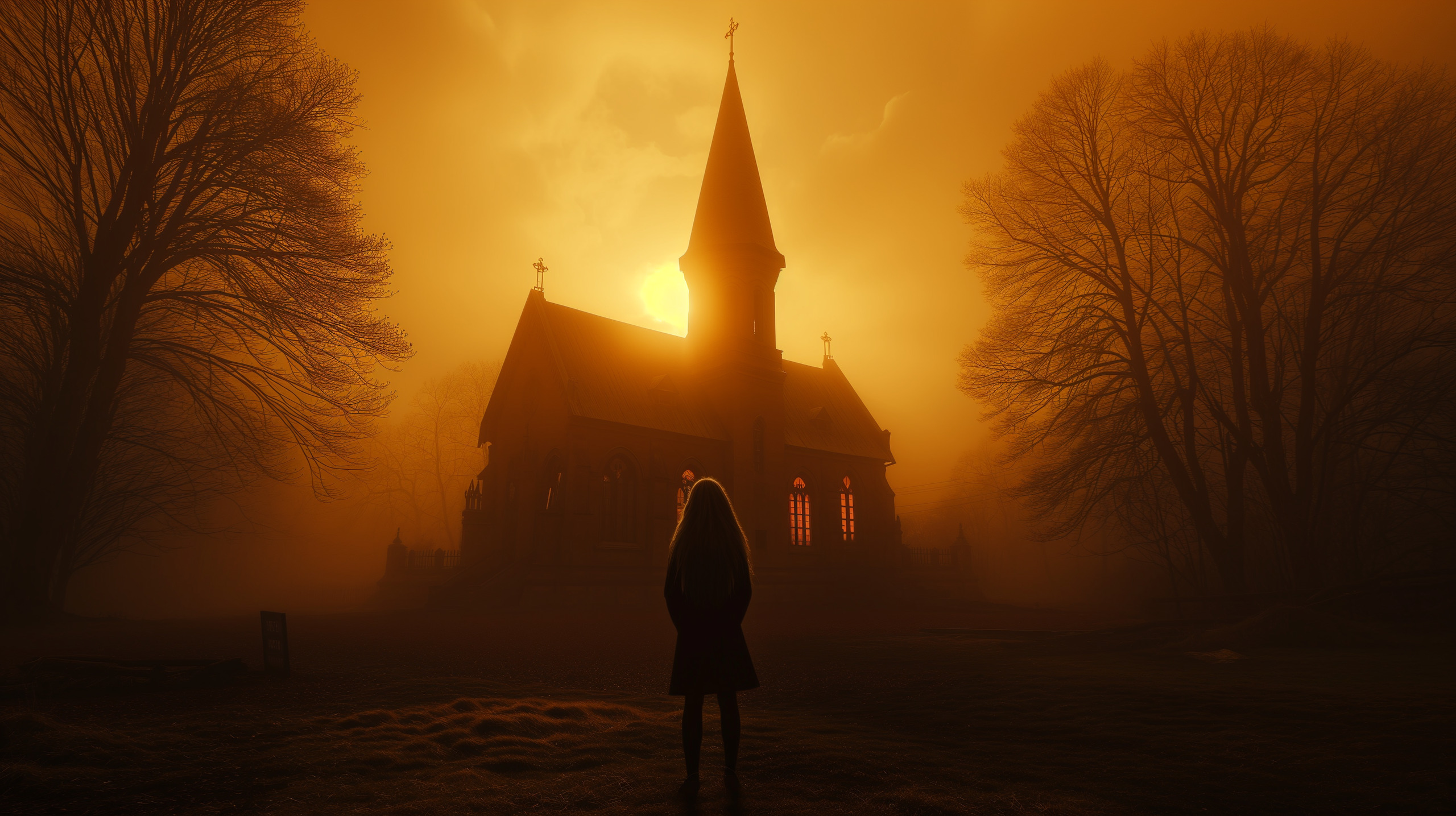 In the hushed glow of dusk, where shadows cast long tales of forgotten lore, she stands – a lone silhouette against the dying light. The church, a sentinel of bygone piety, echoes with the whispers of yesteryears, its stained glass windows now mere specters of sanctity. The world around her breathes a sepulchral stillness, as if the very air awaits a sign. She, the unnamed guardian of secrets, harbors tales of the before time, when laughter filled the halls instead of this spectral silence. But the earth has turned, and with it, the age of despair has risen. She turns to face the sunset, a symbol not of hope, but of an end. The finality of another day lost to the relentless tide of a world unmoored.