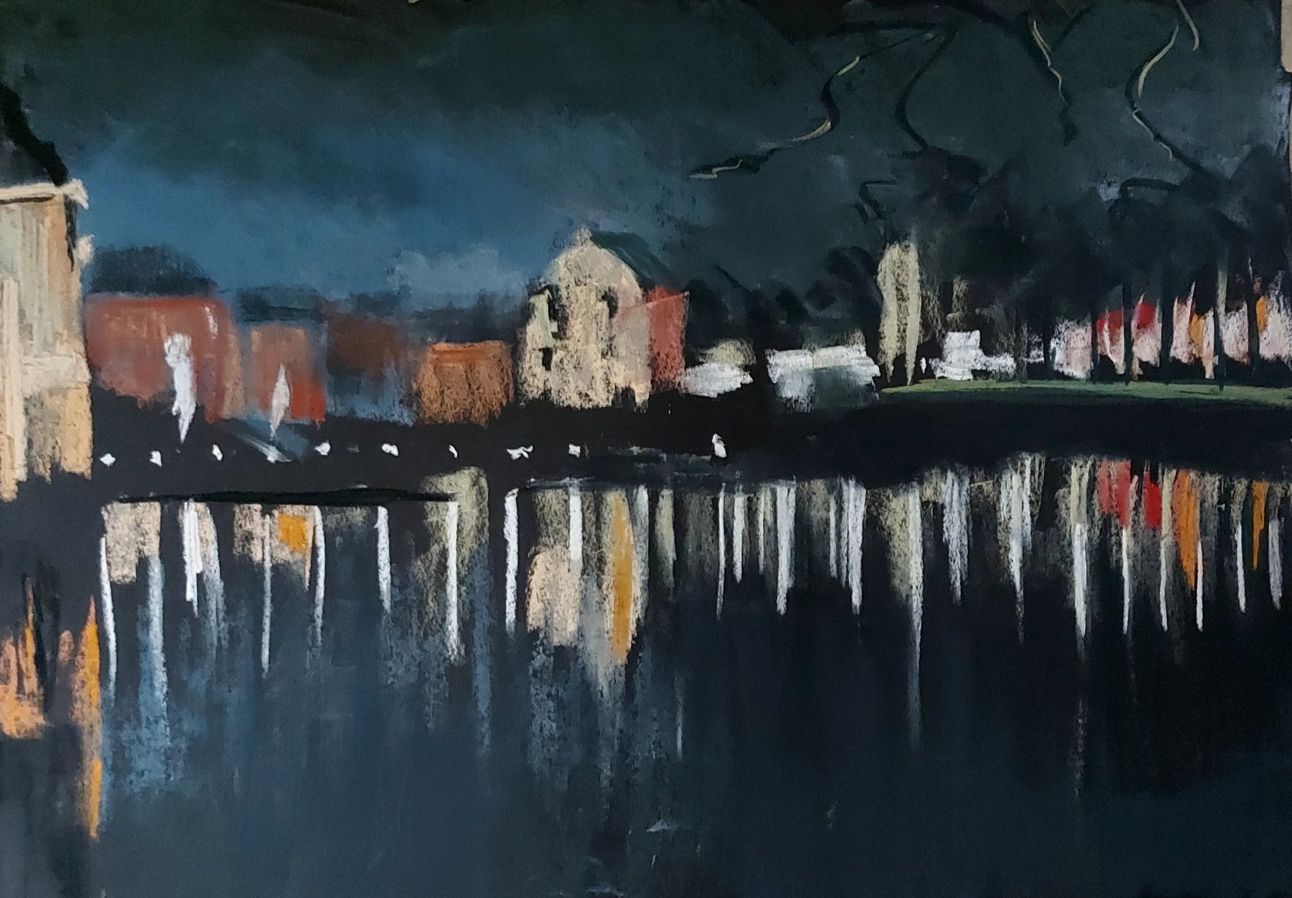 Een sfeerbeeld van Den Haag aan het water, een vrij groot pastel op zwart papier