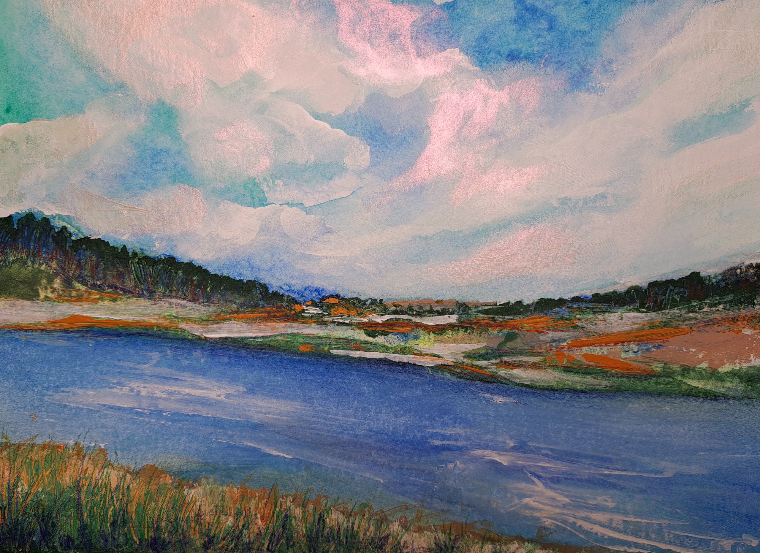Op het ogenblijk experimenteer ik met meer diepte vinden in mijn landschappen en meer abstract werken, dus grotere kwasten gebruiken. Het is een mengelmoes van materiaal want ik gebruik hier waterverf, acrylverf, kleurpotloden en houtskool op een dikke kwaliteit aquarelpapier. Sommige van deze werken zijn later dit jaar beschikbaar!