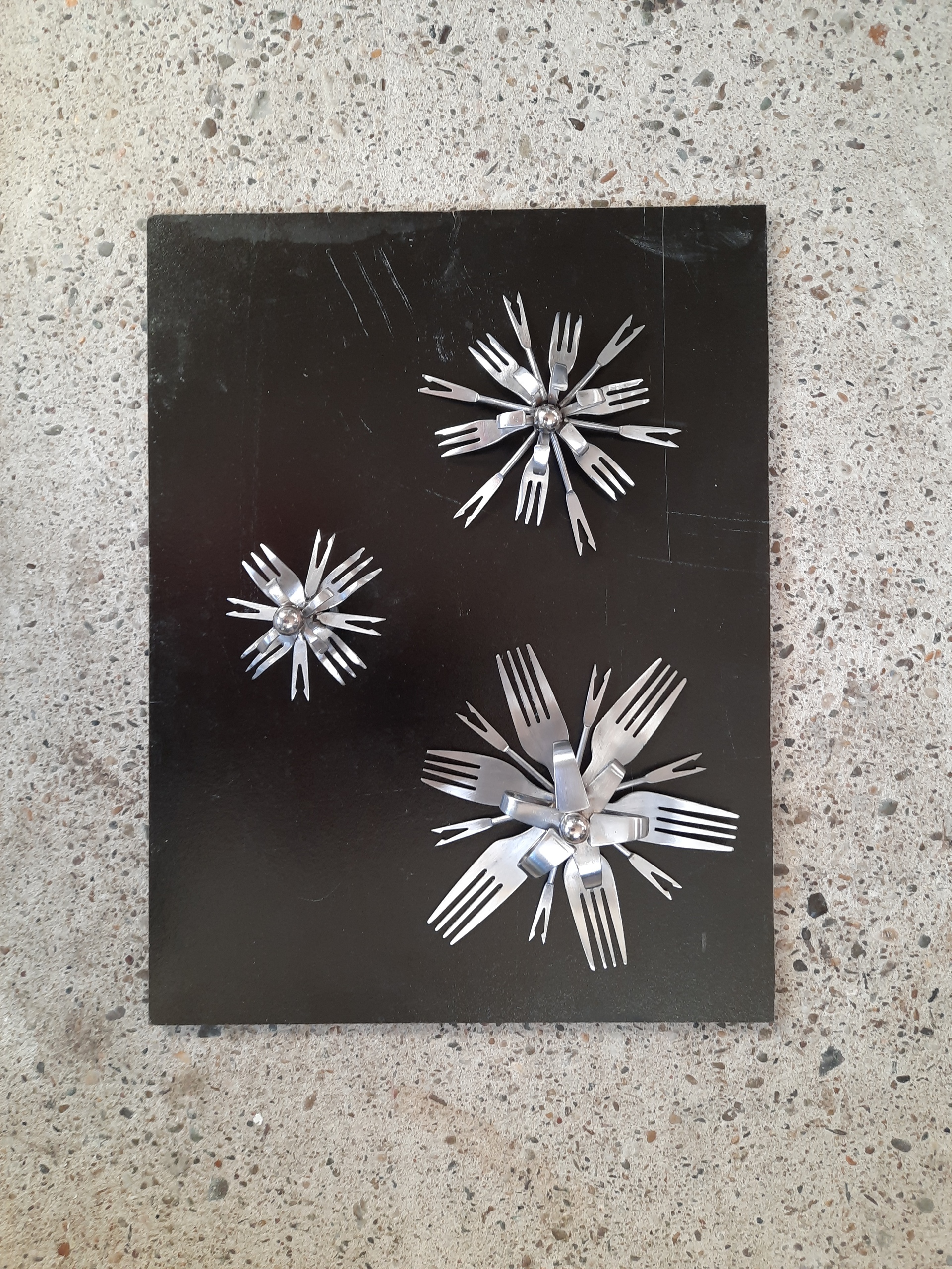 drie rvs vorkbloemen op leisteen