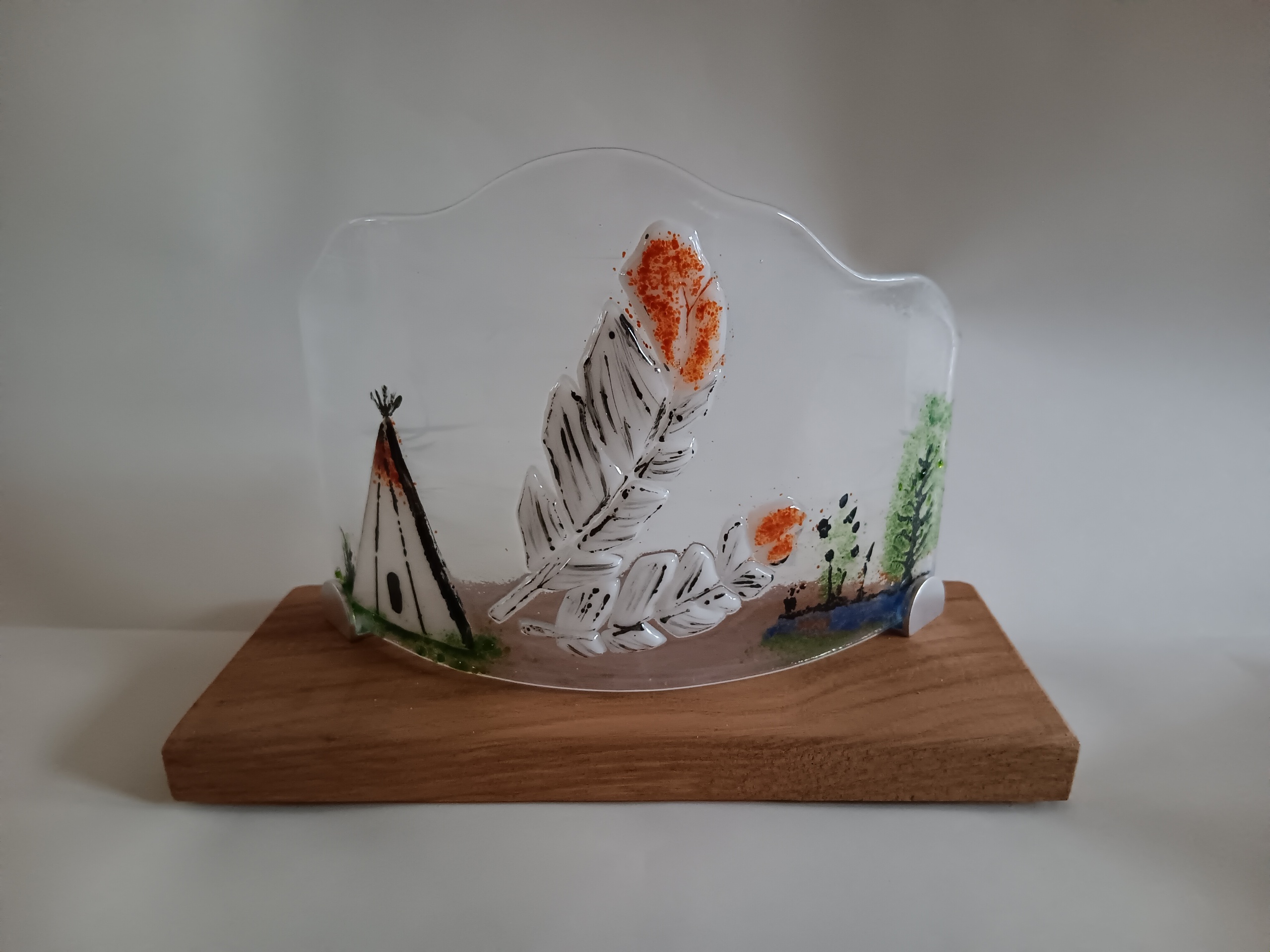 Een ontwerp op verzoek met veren, een wigwam en wat landschap. Gemaakt met glasfusie en wat glasshilderij.