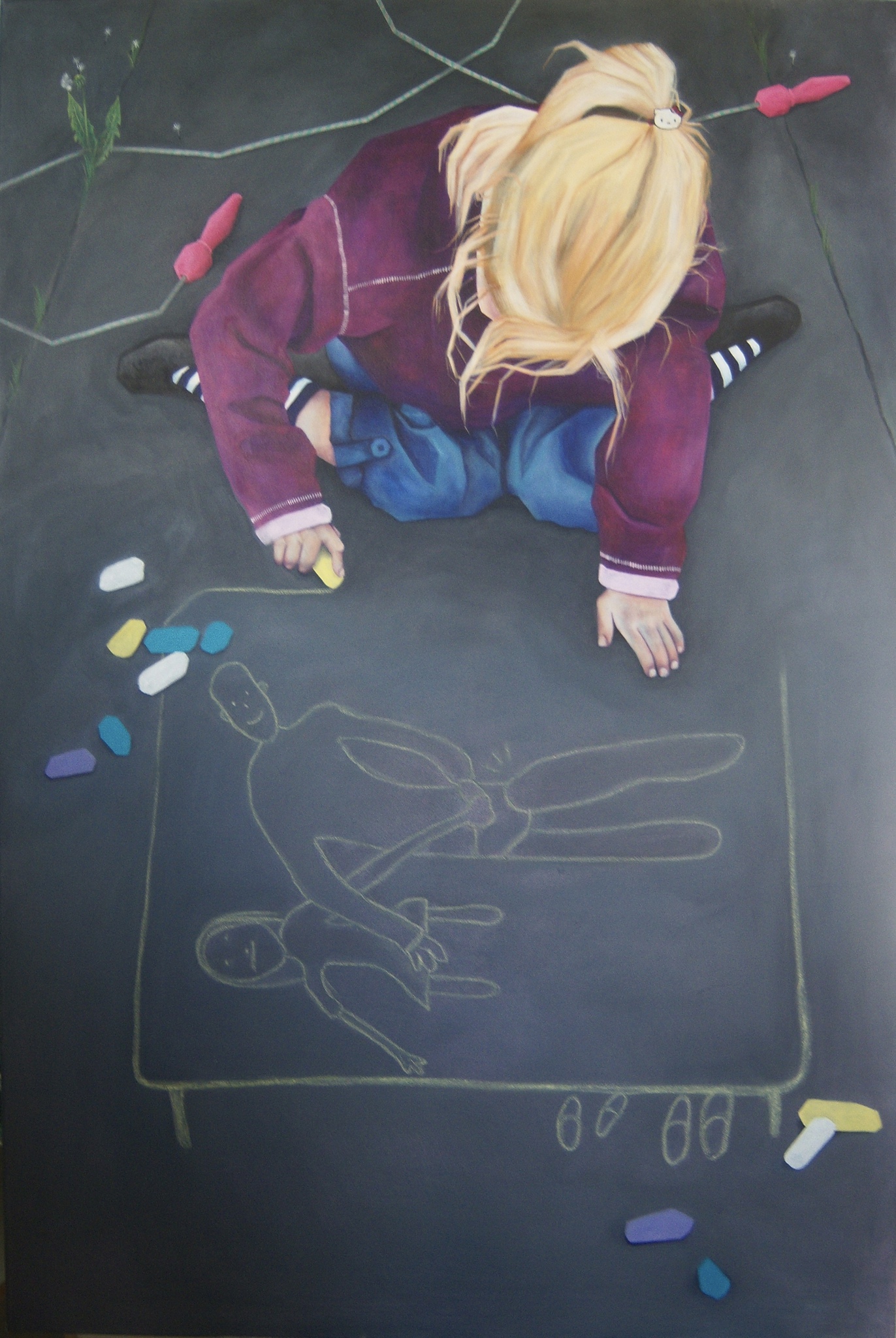 De serie 'stoepkrijten' is gebaseerd op het feit dat 50% van de kinderen voor hun 18de te maken krijgen met een vorm van seksueel geweld. De schilderijen zijn geïnspireerd op een vorm van therapie die therapeuten gebruiken om kinderen hun trauma's te laten verwerken, namelijk door te tekenen. Het blijkt een hele effectieve manier voor kinderen te zijn om zich te uiten. De stoepkrijt tekeningen op de schilderijen zijn echte tekeningen gemaakt door kinderen die zijn blootgesteld aan seksueel geweld. De tekeningen en de kinderen los van elkaar zien, is al zwaar maar de kinderen zo op spelenderwijs samen te zien met de tekeningen maakt het wel een heel heftig beeld.