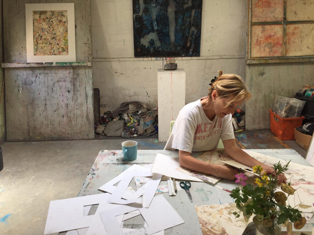 Ik ben Hanneke en heb 23 jaar in de Belgische Ardennen gewoond, waar ik een eigen mozaïek-atelier had. Toen ik in 2012 terugkwam naar Amsterdam, ben ik overgegaan op een andere creatieve werkvorm, met papier, verf, inkt en krijt, waarbij ik op een intuïtieve manier begin te experimenteren zonder te weten waar ik uitkom. Het gaat evenzeer om het proces en het plezier als om het uiteindelijke resultaat.