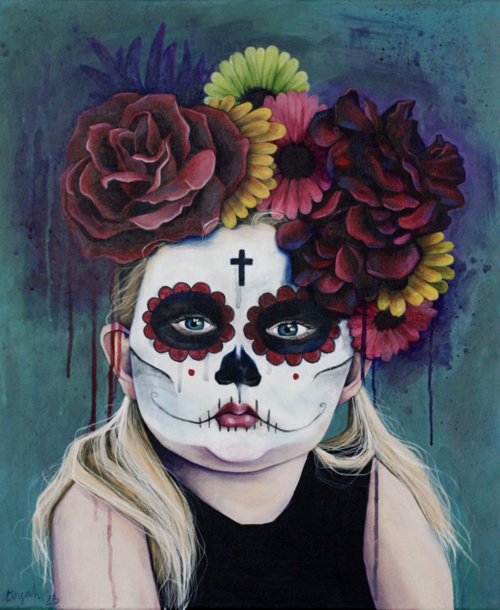 Dit schilderij is geïnspireerd op de Mexicaanse feestdag 'dia de los muertos' ofwel de dag der doden. Het wordt gevierd op 1 en 2 november, op 1 november eert men de overleden kinderen en op 2 november eert men de volwassenen. Men gelooft dat de zielen van de overledenen terug keren naar de aarde. Op deze dagen versiert men de graven en brengt offeren aan de overledenen. Mensen verkleden zich als de doden als een teken van respect aan de overledenen. Ik vind het zo’n mooi idee dat men de dood viert inplaats van de manier waarop wij Europeanen met de dood omgaan.