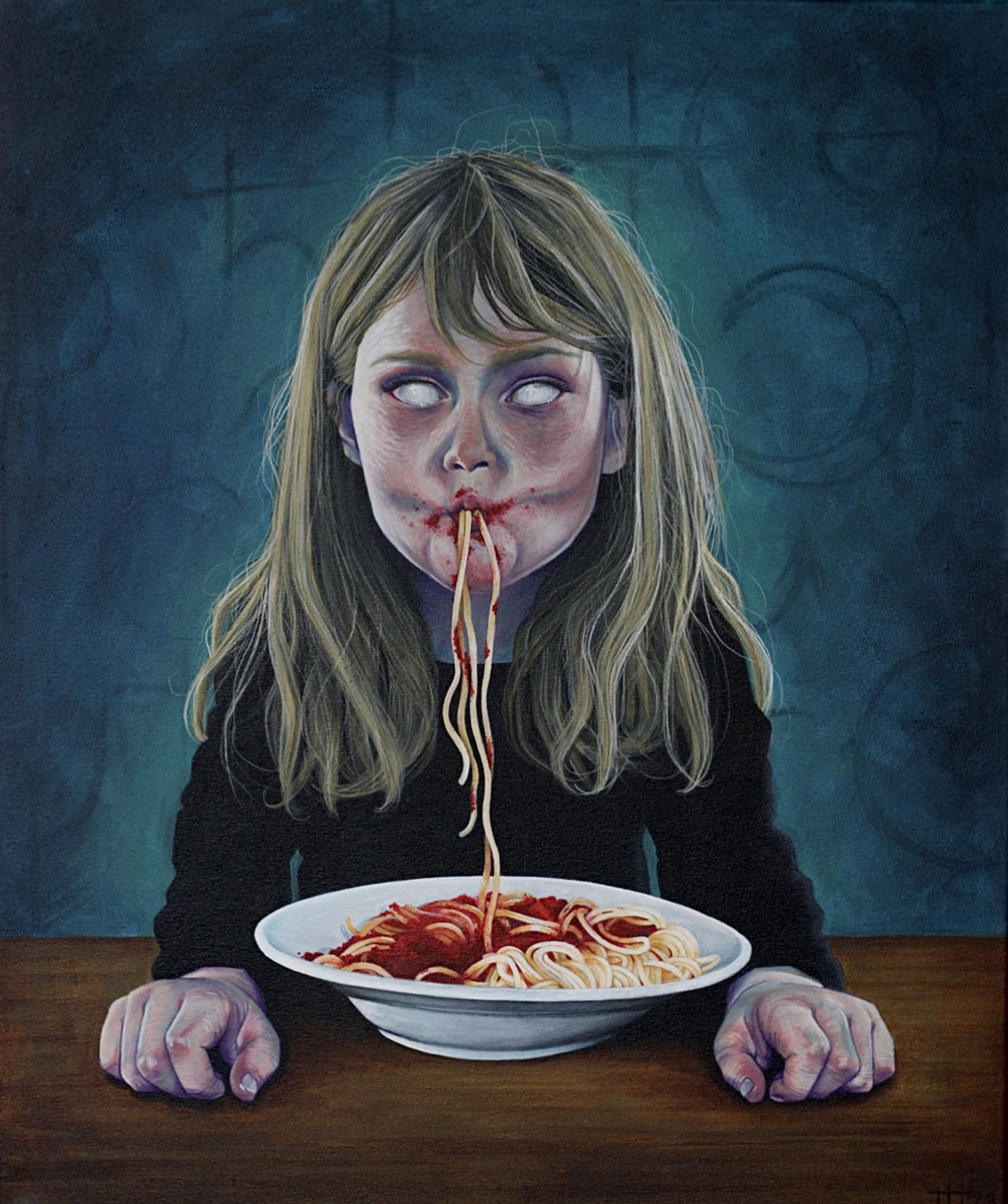 Meisje Kind Eten Spaghetti Duivel Heks Bezeten