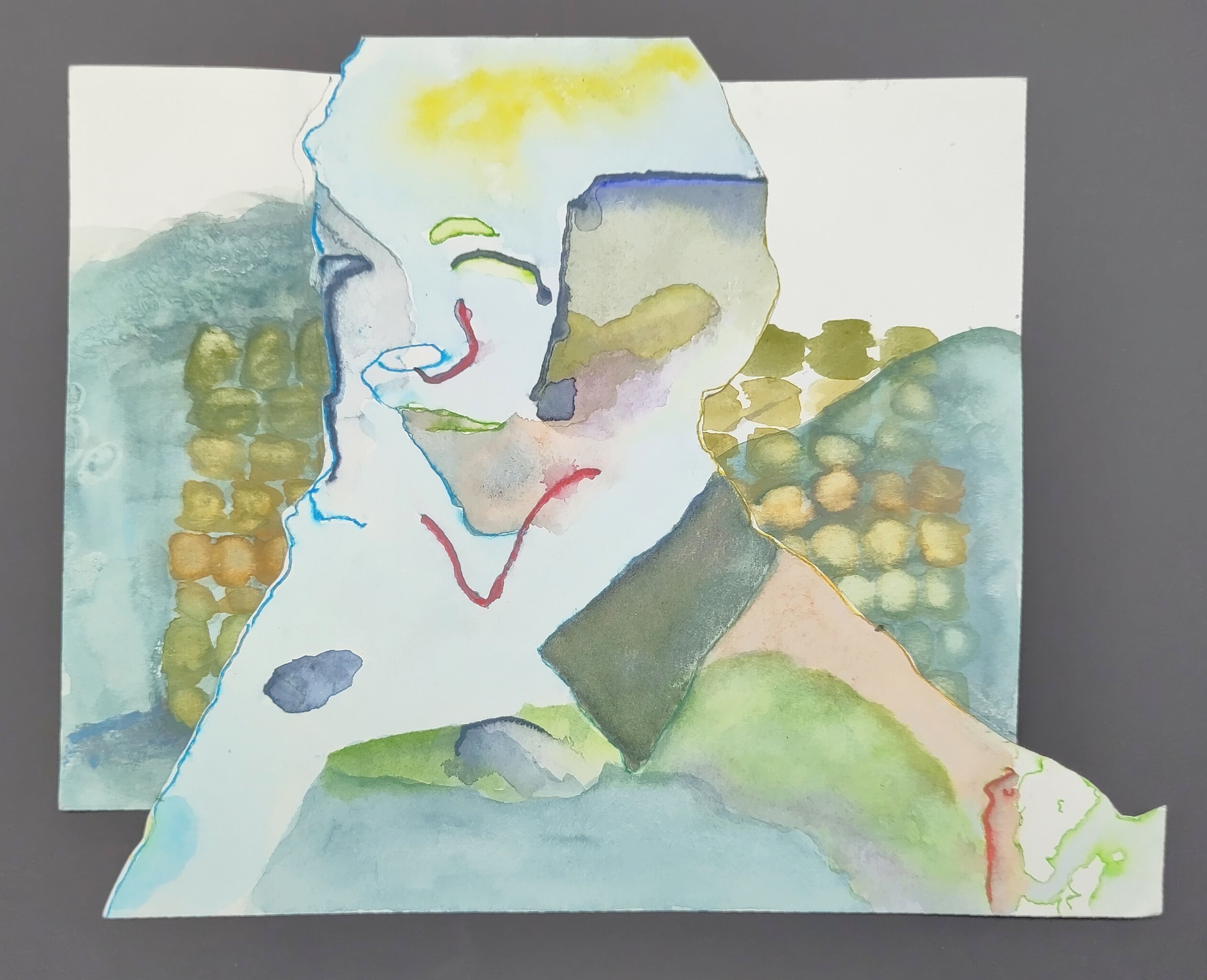 Zo zit ik zelf ook weleens. Aquarel,viltstift, potlood op papier . Twee tekeningen samen. Collage.