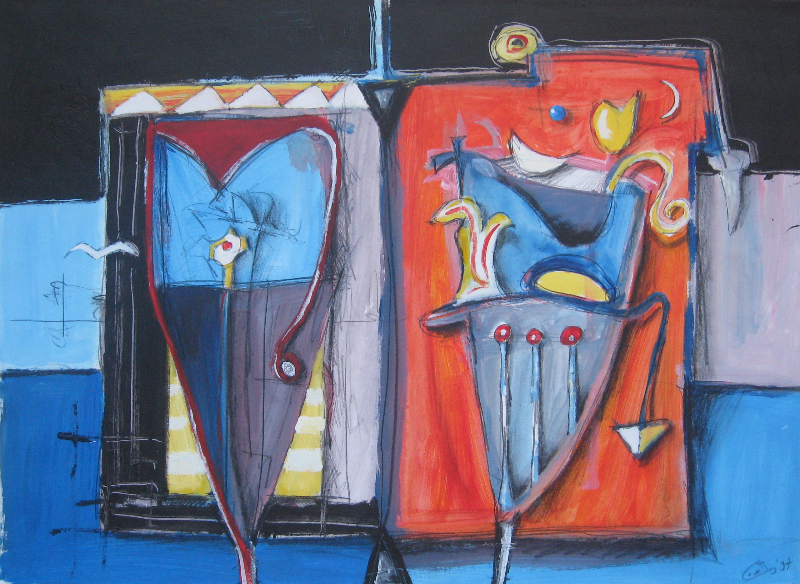 Na jarenlang bezig te zijn geweest met het maken van litho's ben ik overgestapt naar het schilderen omdat mijn manier van werken daar steeds meer om vroeg. Ik hou er van om zonder een specifiek uitgangspunt te beginnen en al werkend tot het uiteindelijke resultaat te komen. En alle technieken te gebruiken die er maar nodig zijn om dat resultaat te bereiken. Inspiratie haal ik uit de natuur,gebeurtenissen om mij heen en de muziek die ik altijd onder mijn werk aan hebt staan.