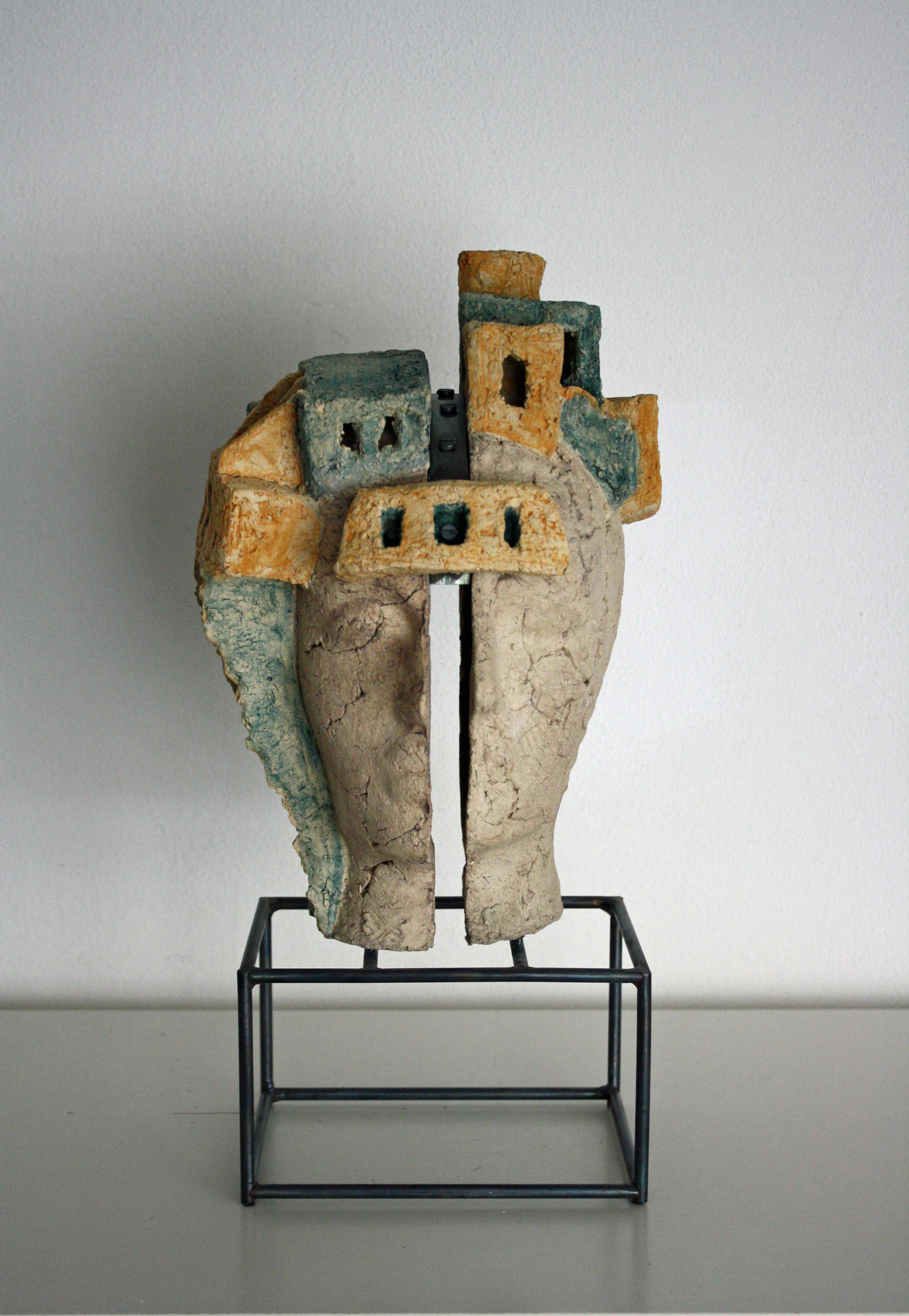 Klei, grof, gevormd, geduwd, geschraapt. Ruwe huid, schrale kleur en soms gecombineerd met metaal. Hiermee kan ik mijn ideeën en gedachten verbeelden. Mijn beeld vertelt, de kijker luistert.