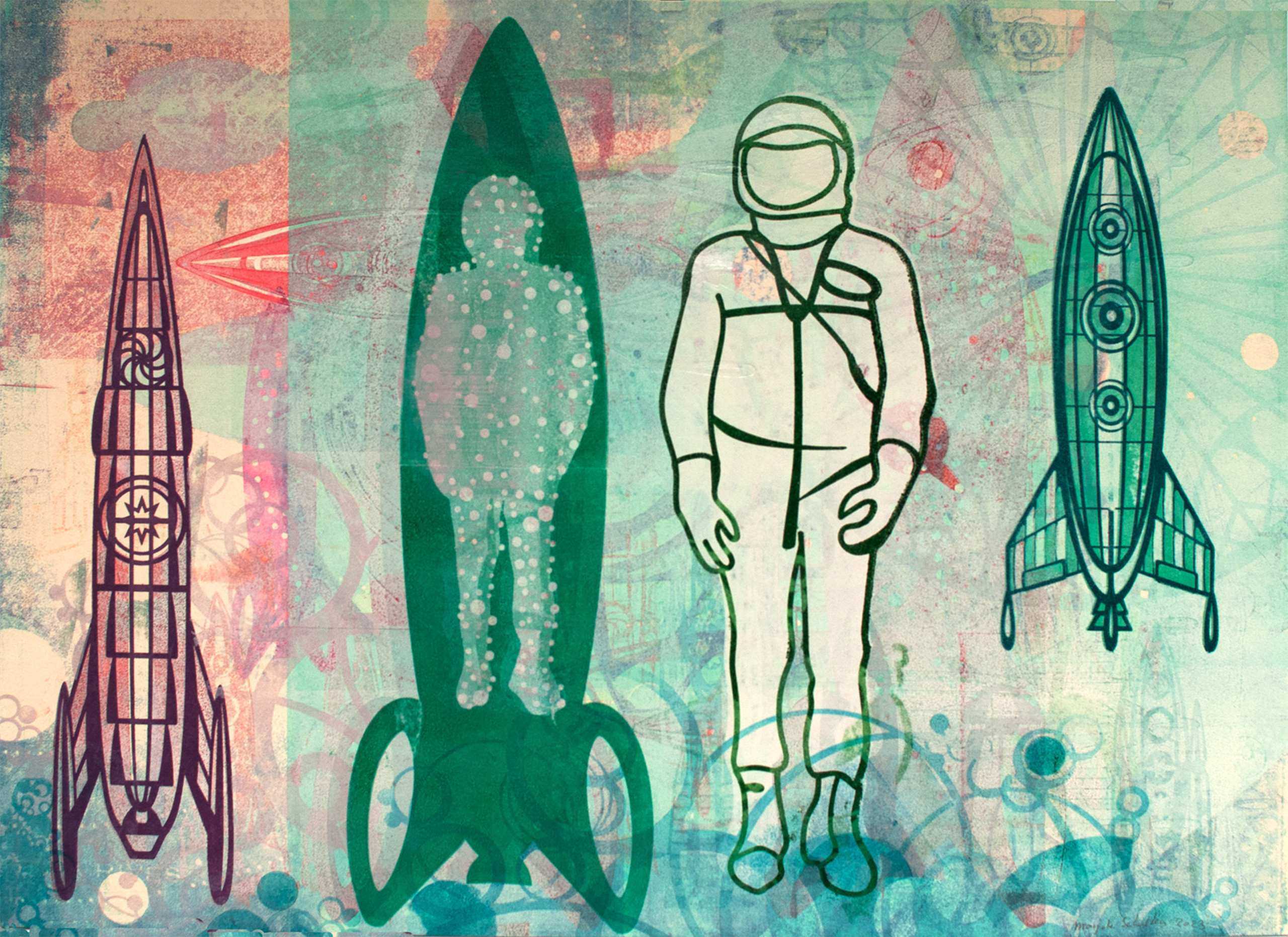Raket Armada Voor Ruimtereis Kleurrijk Grafiek Hoogdrukkunst Astronaut