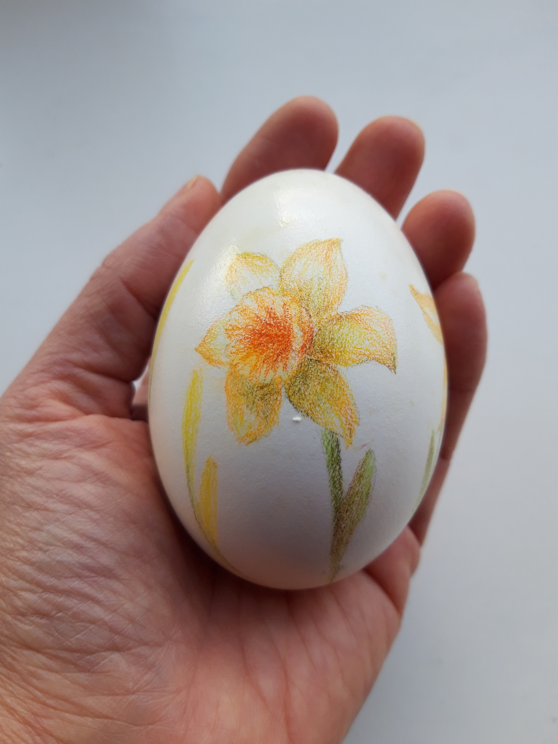 Kleurpotloden op ganzenei. Bloemen zijn door het heel ei geschilderd. Prijs is excl. verzendkosten, die zijn €7,95 binnen Nederland. Ei wordt zonder houder aangeboden.