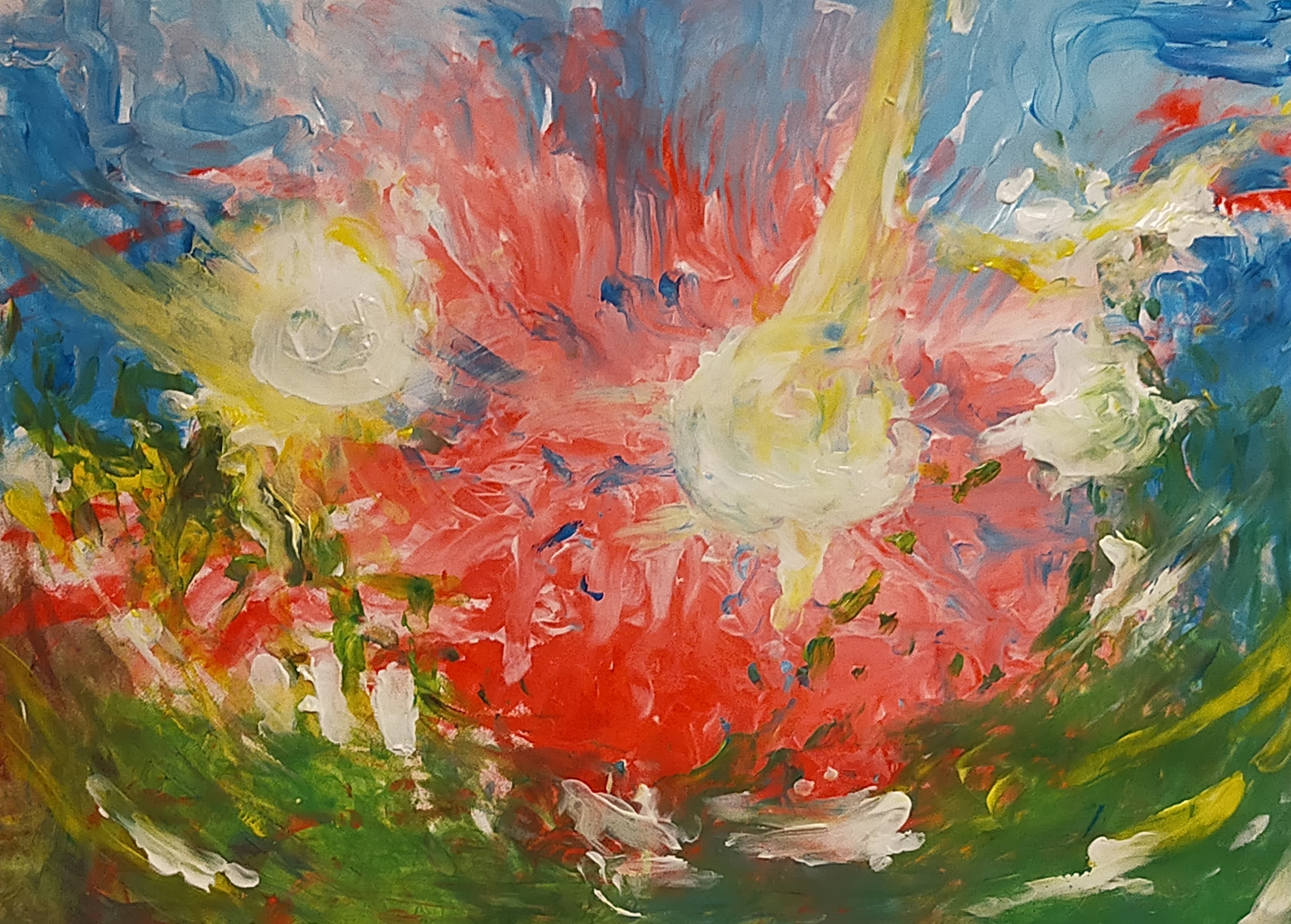 Bij het tot stand komen van dit werk had ik echt geen idee welke kant het opging. Wel ervaarde ik zo'n geweldige liefdevolle aanwezigheid van de Geest van Jezus! Grotendeels komt de vormgeving tot stand door verf te voelen en dik aan te brengen, grotendeels met mijn ogen dicht. Wat een ervaring.