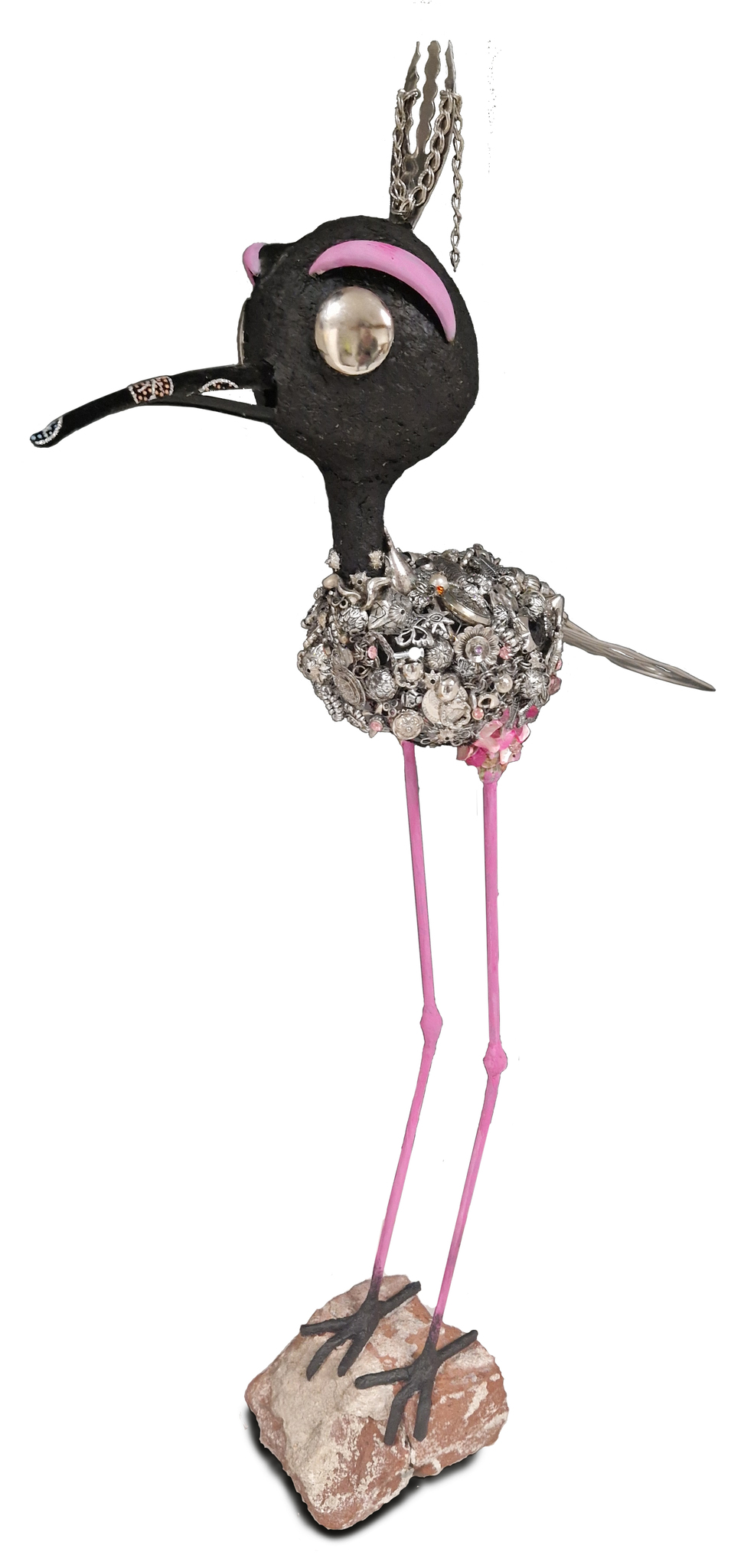 vogel vervaardigd van (deels) papiermaché en "bling-bling" ketting-onderdelen
