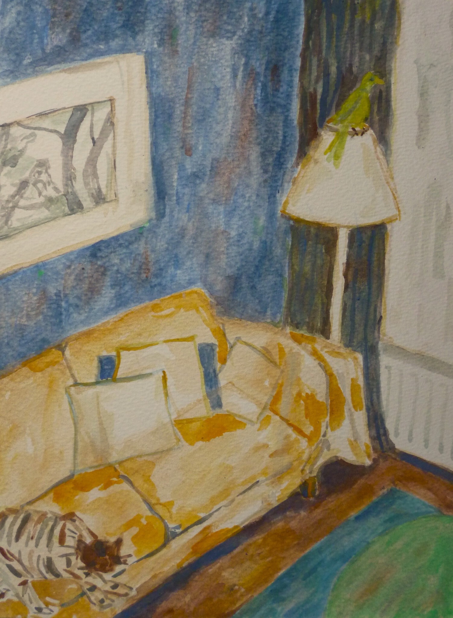 Kanarie en kat in huiskamer.