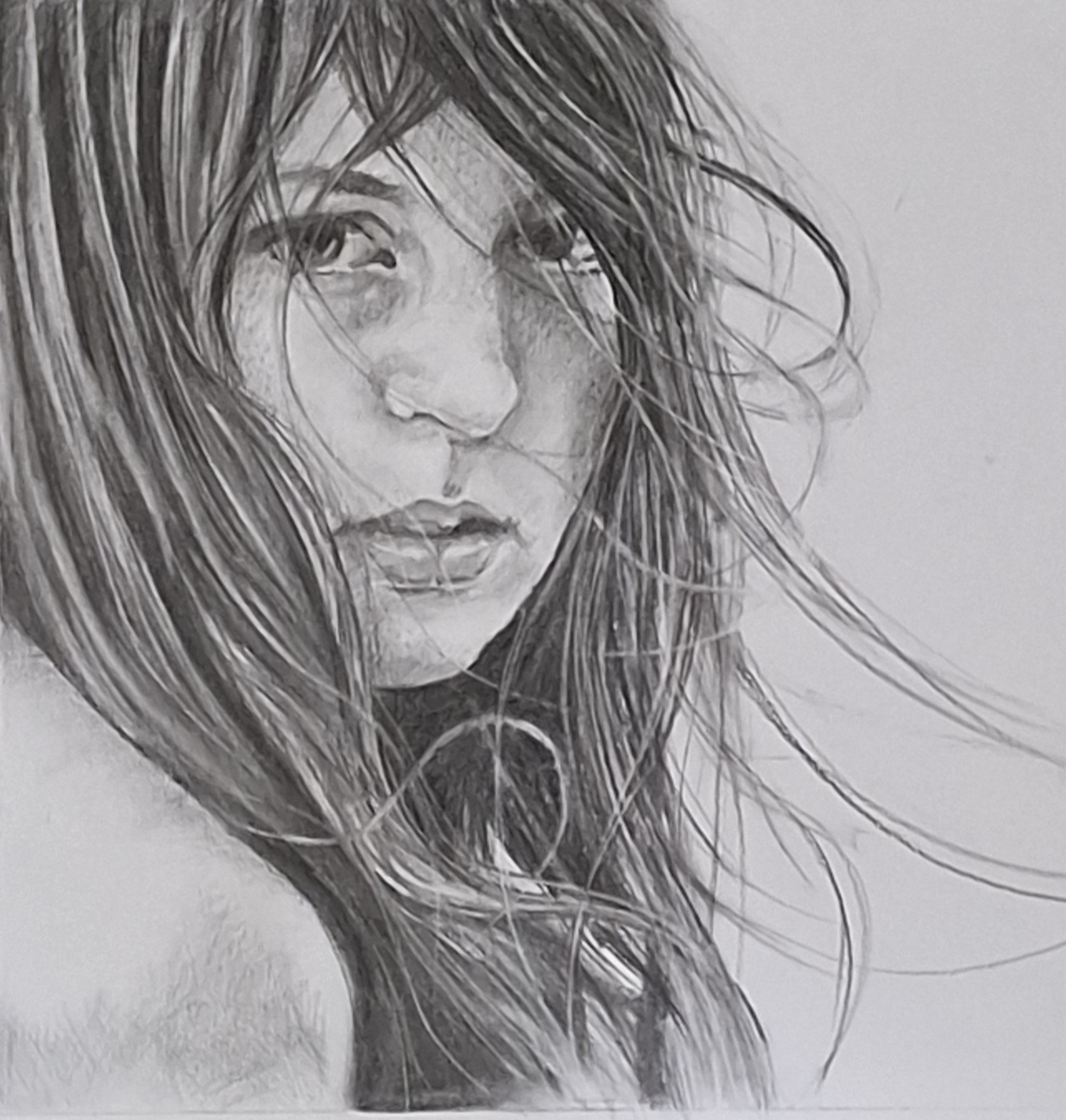 Portret van een meisje met de wind in de haren. Met houtskool getekend
