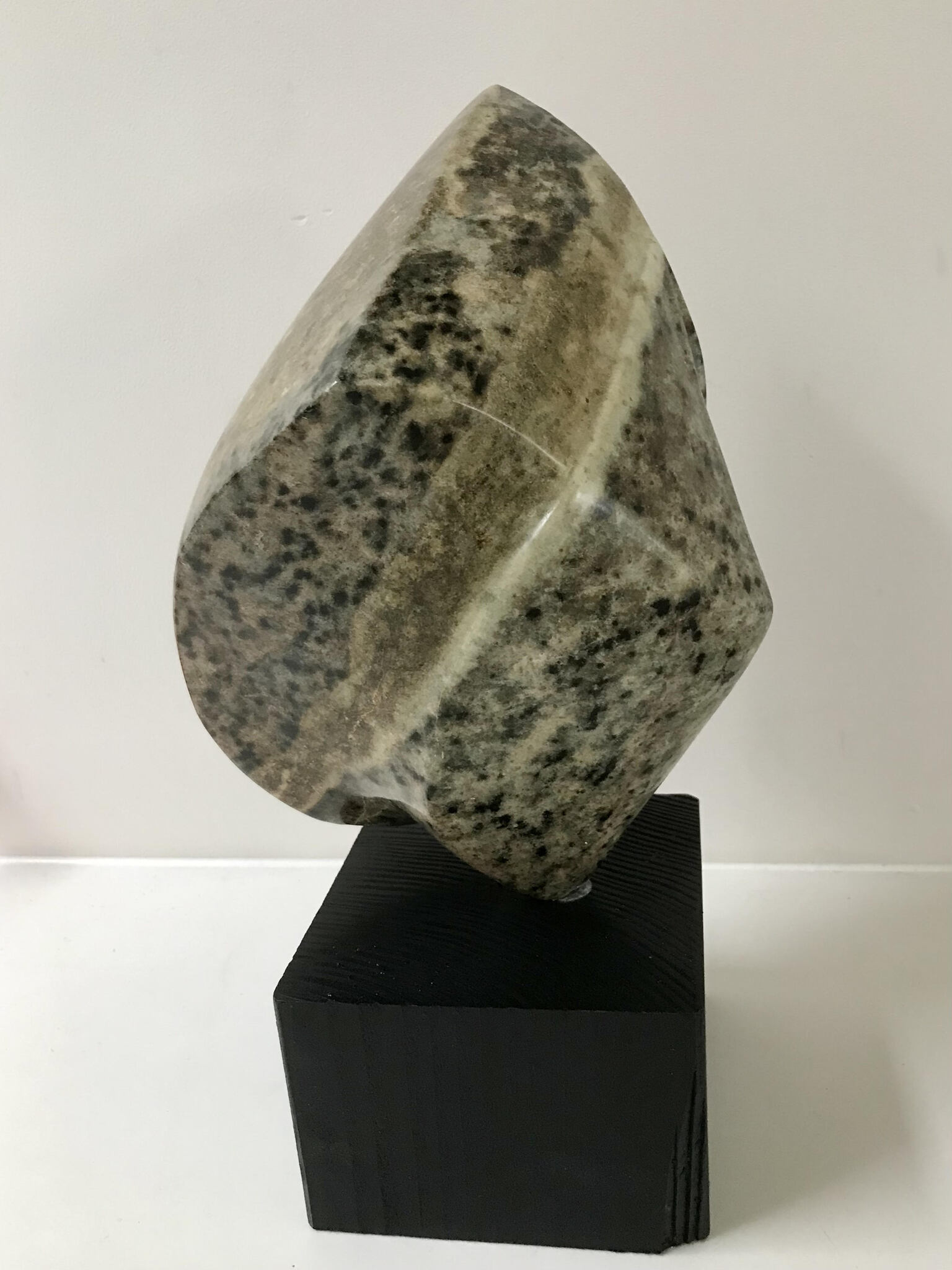 Een abstract beeld waar ik gebruik heb gemaakt van de mooie tekening in de steen. De sokkel is van hout. Verkocht