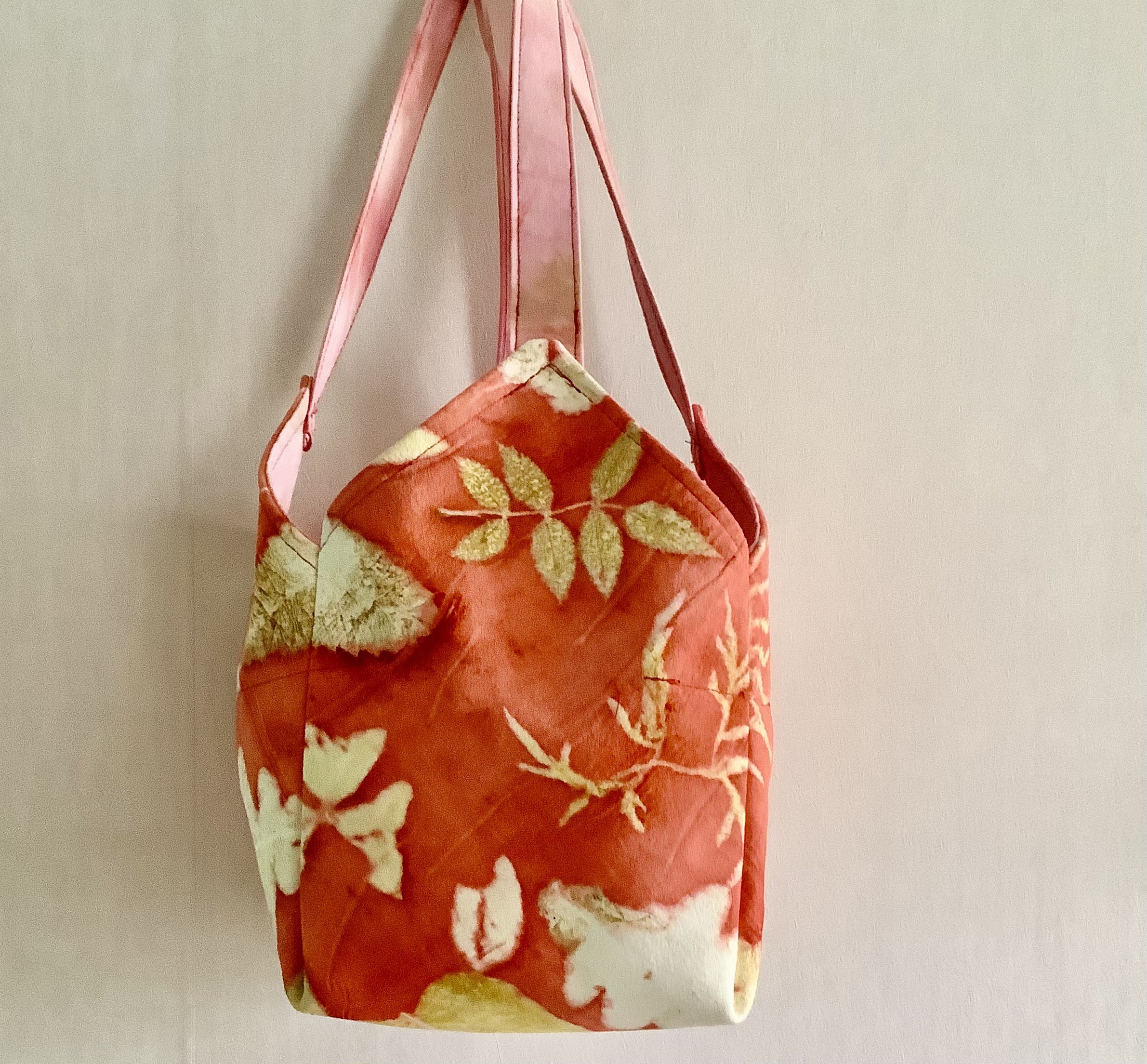 Deze ecoprint tas is van hertenleer en gevoerd met een katoenen lap met ecoprints. Het model heet origami. Het is een zachte tas en licht van gewicht.