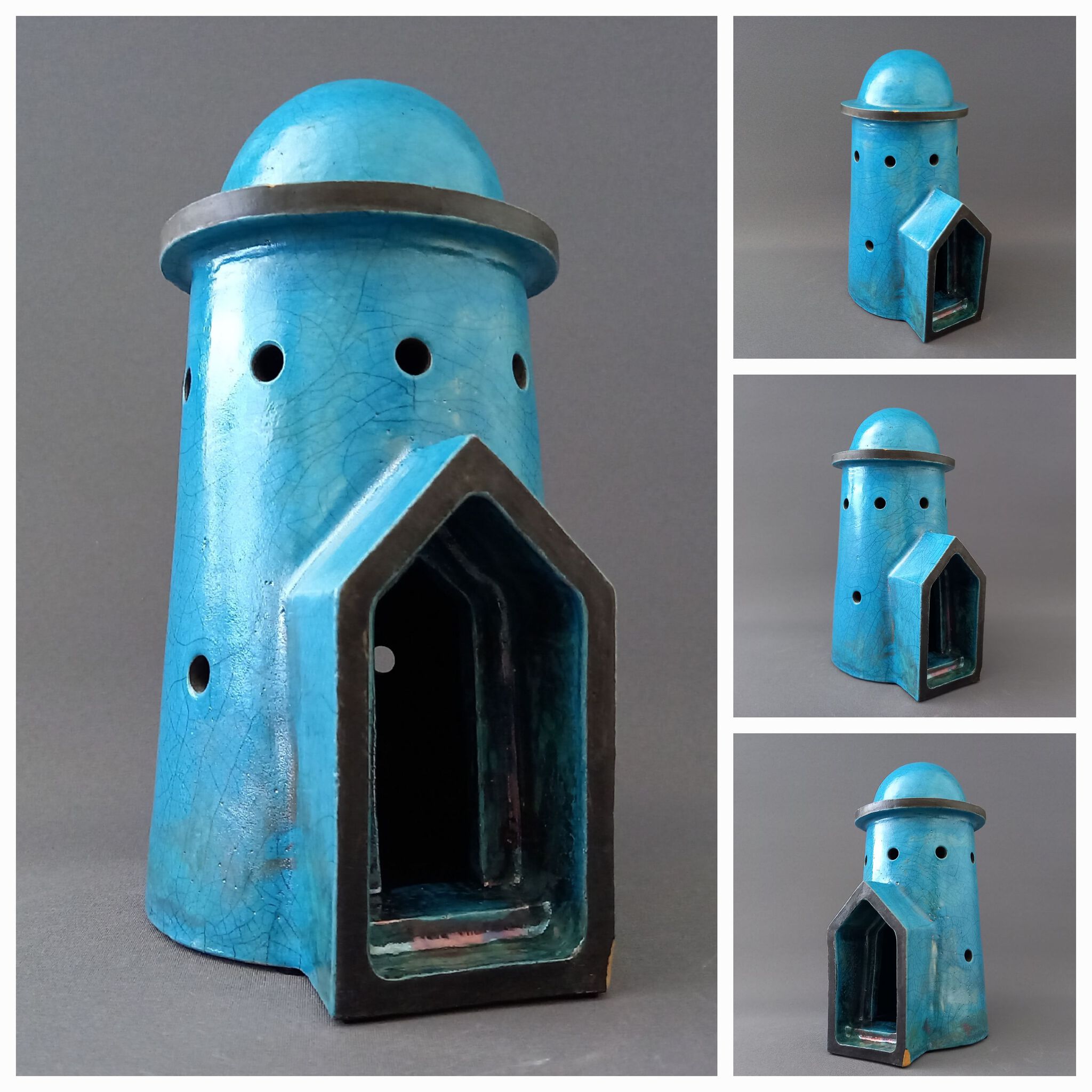 Dome-Toren. Raku gestookt. Witte klei met turquoise glazuur en Kintsugi accenten