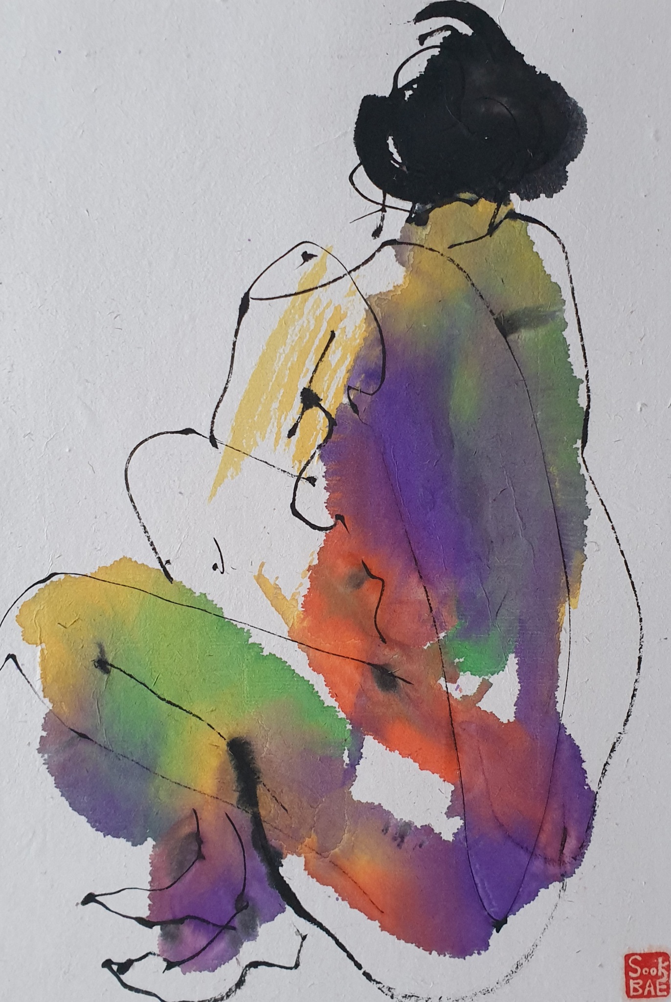 Sook Bae(1959)is in 1980 afgestudeerd aan de young nam college(Toegepast kunsten) in zuid-korea In 1996 volgde zij modeltekenen aan de Grand Academie te parijs Sins 1997 woont ze in Amsterdam. "ik teken en schilder direct naar model Het onderwerp dat my blijvend inspireert is de mens; poserend of bezig met alledaagse dingen, De techniek van het tekenen is sumi-e is mijn grote Liefde. Als ik goed bezig ben, werken mijn ogen en handen Samen en is mijn hoofd leeg; het voelt als een Meditatie"