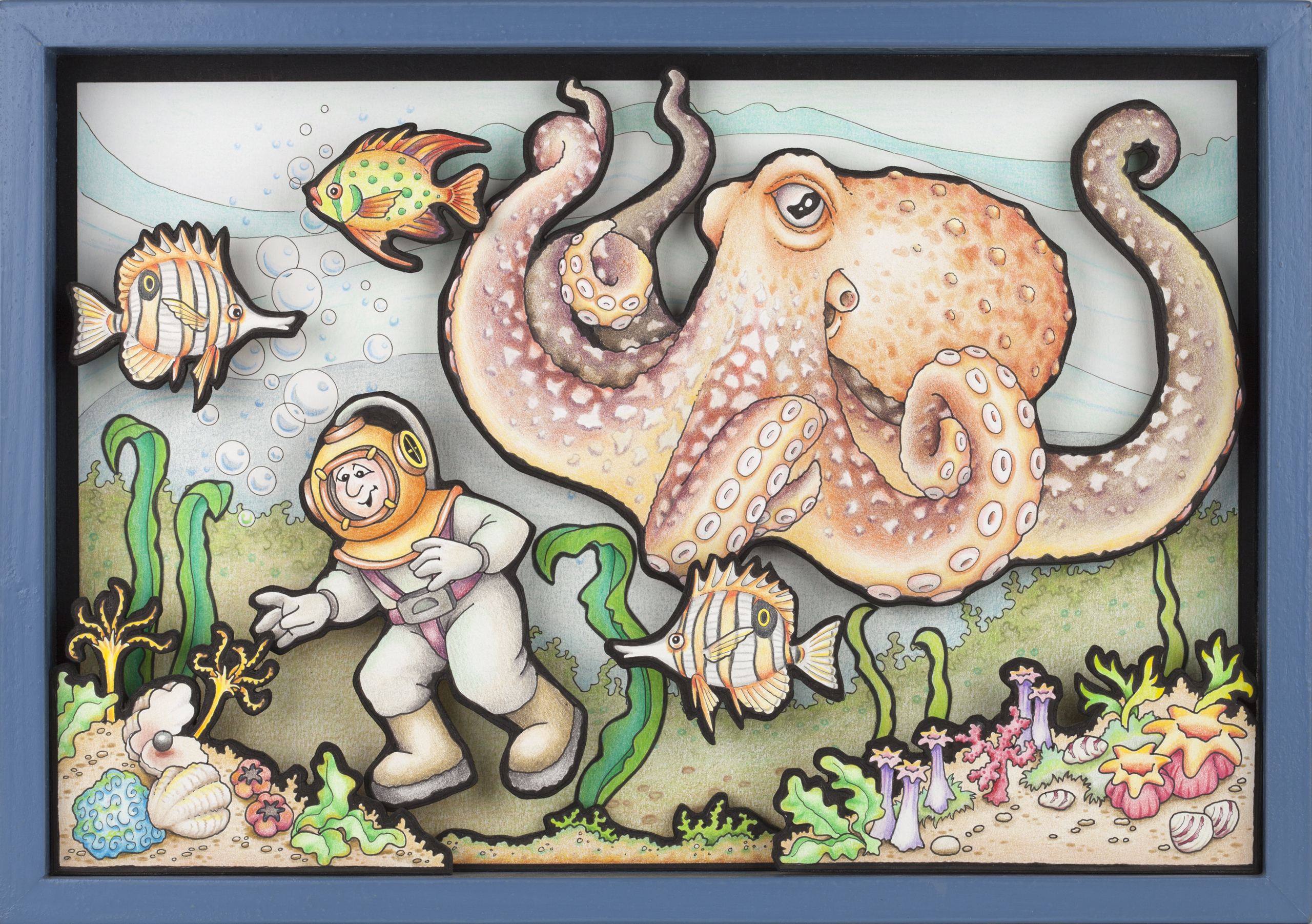 Het liefst maak ik verhalende tekeningen met wat humor, geplaatst in drie-dimensionale houten kistjes. Maar ook beeldhouwwerk, keramiek en textiel. Altijd figuratief met veel details.