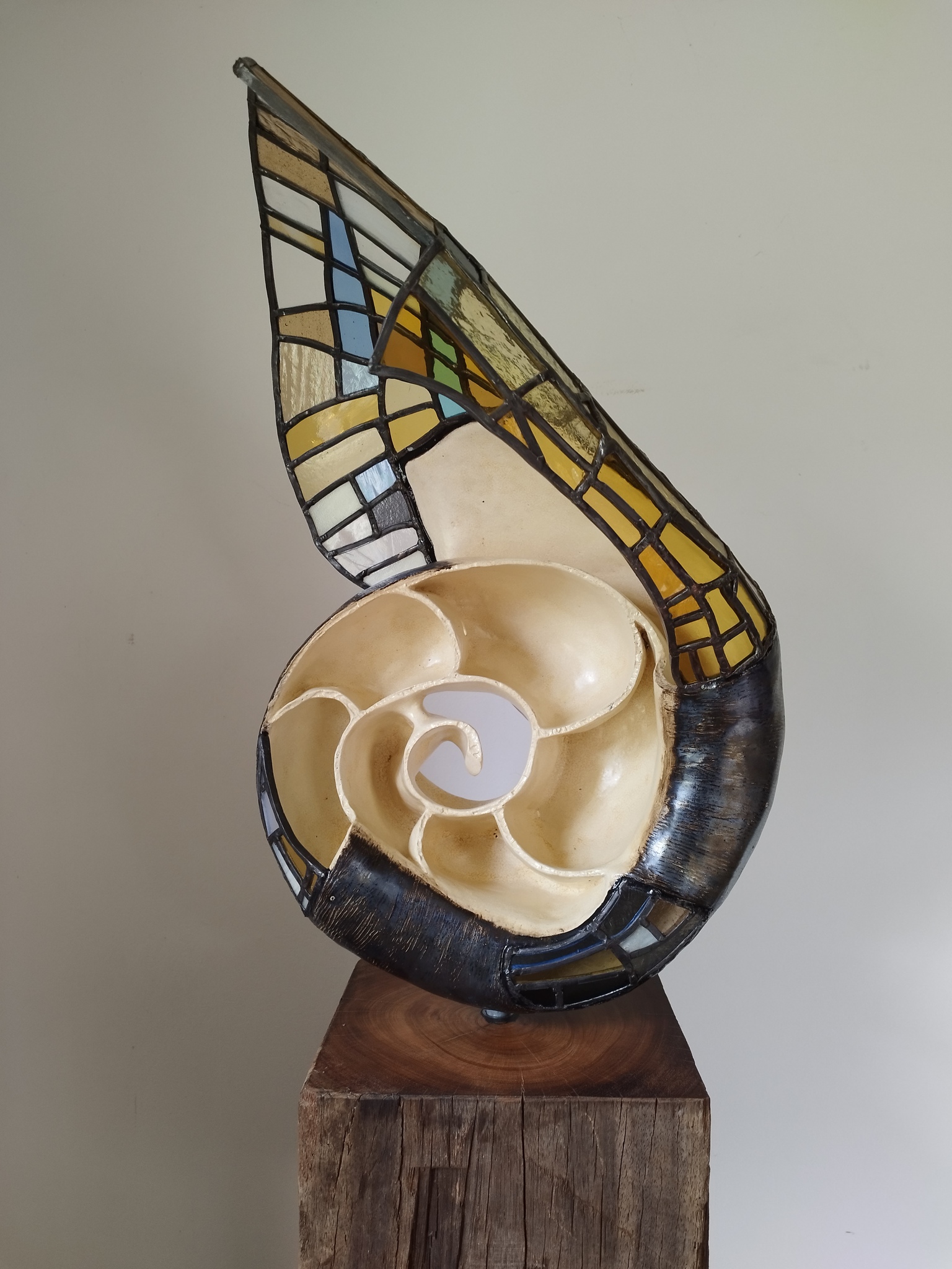 Keramiek met glas in lood op houten sokkel (meerpaal van basralocus)