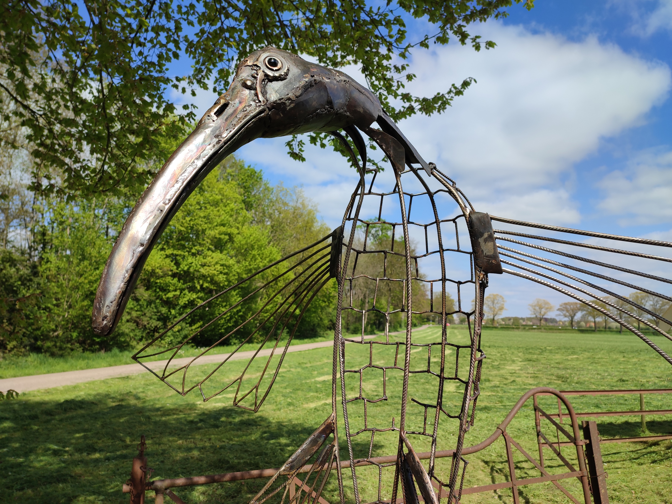 kruising heilige ibis met vliegende vis staal, cortenstaal en glas op betonnen sokkel