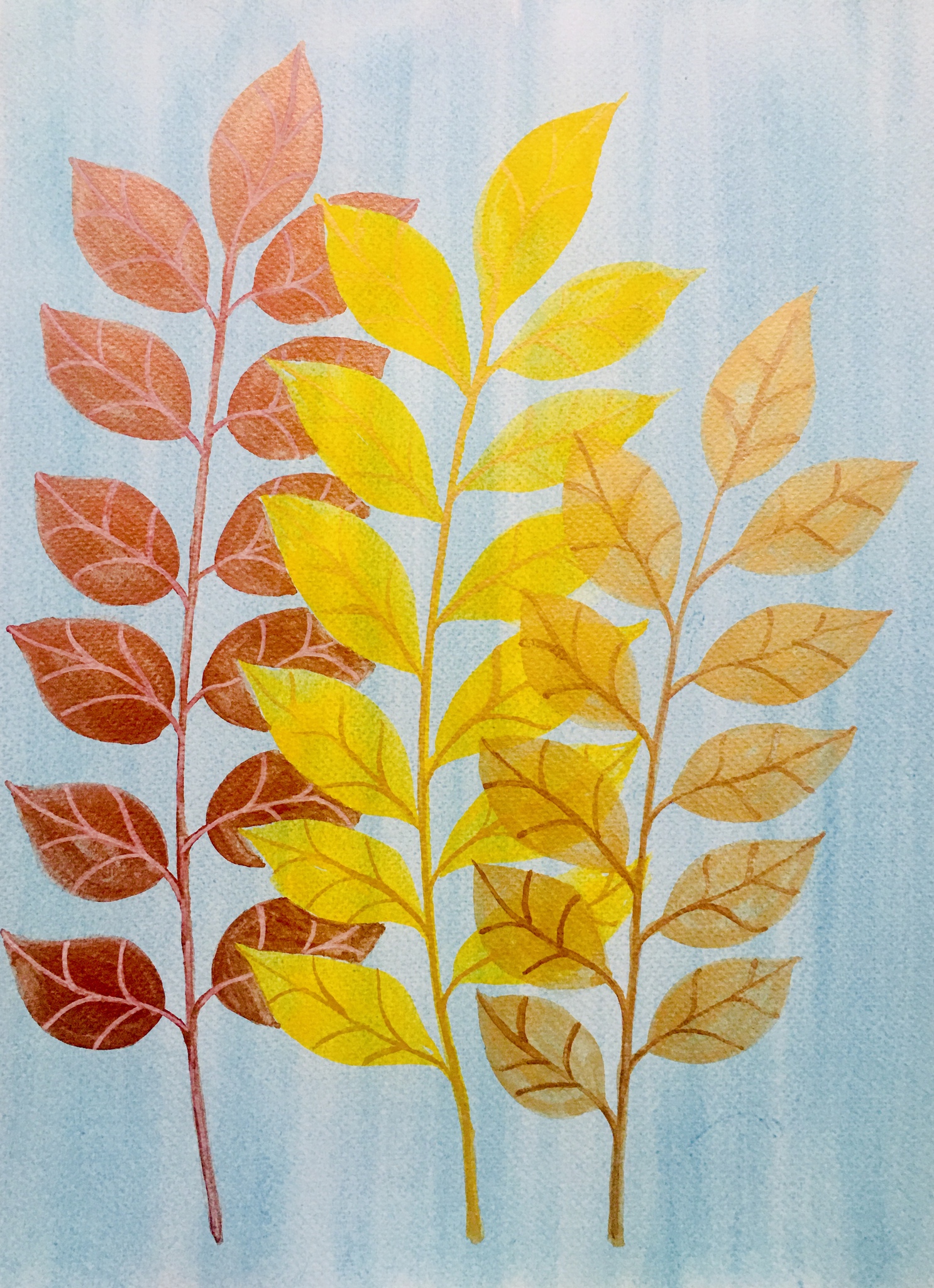 Aquarelschilderij, 2024 Deze warme en kleurrijke aquarelillustratie toont drie elegante bladtakken in herfsttinten: rood, felgeel en goudbruin. De bladeren zijn symmetrisch en verfijnd getekend, met subtiele nerven die diepte en textuur geven. De blauwe achtergrond zorgt voor een fris kleurcontrast, waardoor de warme tinten extra opvallen. Het werk ademt een rustige, seizoensgebonden sfeer uit en combineert natuurlijke vormen met een helder en harmonieus kleurenpalet.