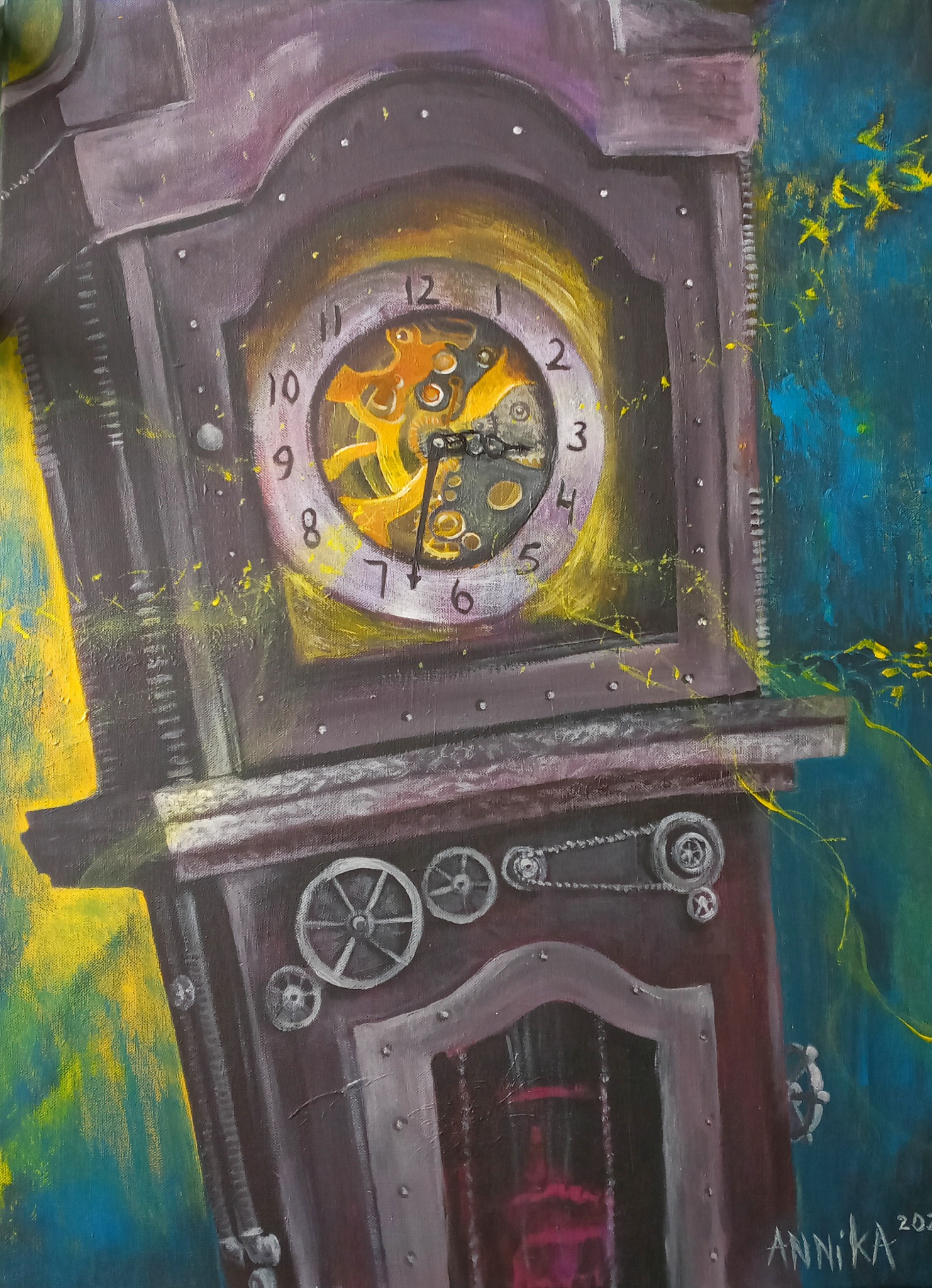 Op een nacht ontving ik het idee om een schilderij te maken van een Magische Klok. Er hoorde een verhaal bij over jou en mij. Je kwam mij tegen, ik was als een vintage steampunk klok, al een beetje verweerd door de jaren, voorzien van een laagje 'patina'. Je dacht: dat is een mooie schat die ik heb gevonden! Ik ga haar nog mooier en nog meer waard maken door alle onderdelen op te poetsen, ik fluister liefdevolle woorden in haar diepste ziel. Sommige onderdelen waren scherp, waardoor je je eraan openhaalde. Maar je leerde om de scherpe randjes voorzichtig te vermijden. Je ging geduldig door met oppoetsen. Sommige onderdelen moest je daarvoor helemaal uit elkaar halen om erbij te kunnen. Een jaar lang poetste je alle onderdeeltjes zorgvuldig, zodat ze gingen glimmen, twinkelen en gloeien. Een aantal onderdelen gingen zo mooi stralen dat ze regenbogen weerkaatsten. Toen het werk klaar was, moest de klok weer één werkend geheel worden, maar je liet de glimmende onderdelen uit je handen vallen. Ze bleven stil op de werktafel liggen, drie dagen lang. En na die drie dagen begonnen de glimmende onderdelen te trillen en te bewegen; door de kracht van liefde die van de glimmende onderdelen af kwam. Langzaam bewogen de onderdelen naar elkaar toe en smolten samen. De versmolten onderdelen waren weer een klok geworden, een Magische Klok! Een eigenzinnige klok die niet de tijd aangeeft van de buitenwereld, maar de tijd van de klok zelf. De tijd, zoals die in het moment gevoeld wordt door de klok en betekenis heeft. De Magische Klok werd zo een schat met een waarde, die niet in geld uit te drukken is!