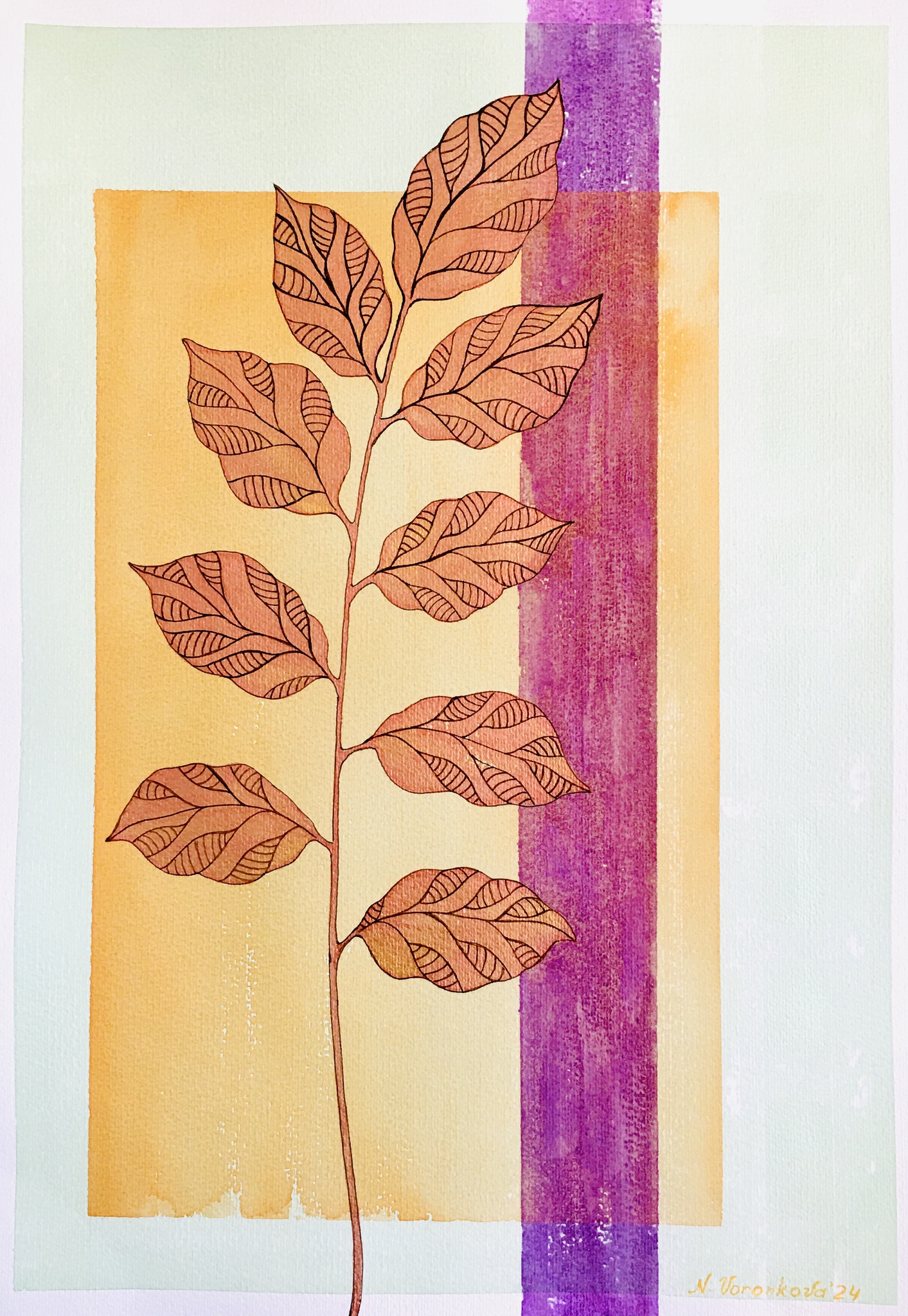 Aquarelschilderij, 2024 Deze illustratie toont een sierlijke tak met roodbruine bladeren, elk voorzien van fijne lijnpatronen. De tak staat centraal tegen een geometrische achtergrond van zachte kleurvlakken: een warmoranje rechthoek en een verticale paarse strook die het beeld diepte en contrast geven. De combinatie van natuurlijke vormen met strakke, moderne kleurvlakken zorgt voor een boeiend evenwicht tussen organisch en grafisch design.