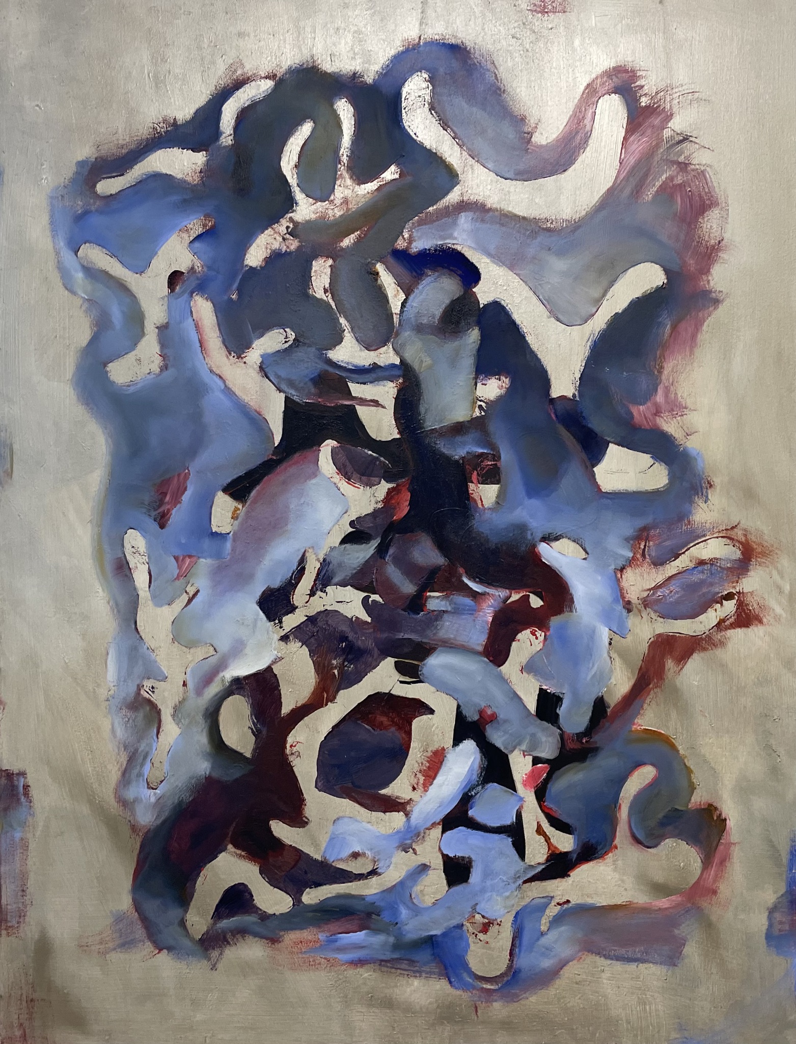Tijdens het schilderen met zacht blauwe pastel tinten, ontvouwt zich een delicate balans tussen rust en levendigheid. Het schilderij met deze etherische vormen stralen openheid uit. Temidden van deze zachte kleuren voeg ik het donker rood toe, het brengt tegelijk dynamiek in het werk, een contrast dat het oog blijft vangen. Het is een stille dialoog tussen kleur en ruimte.