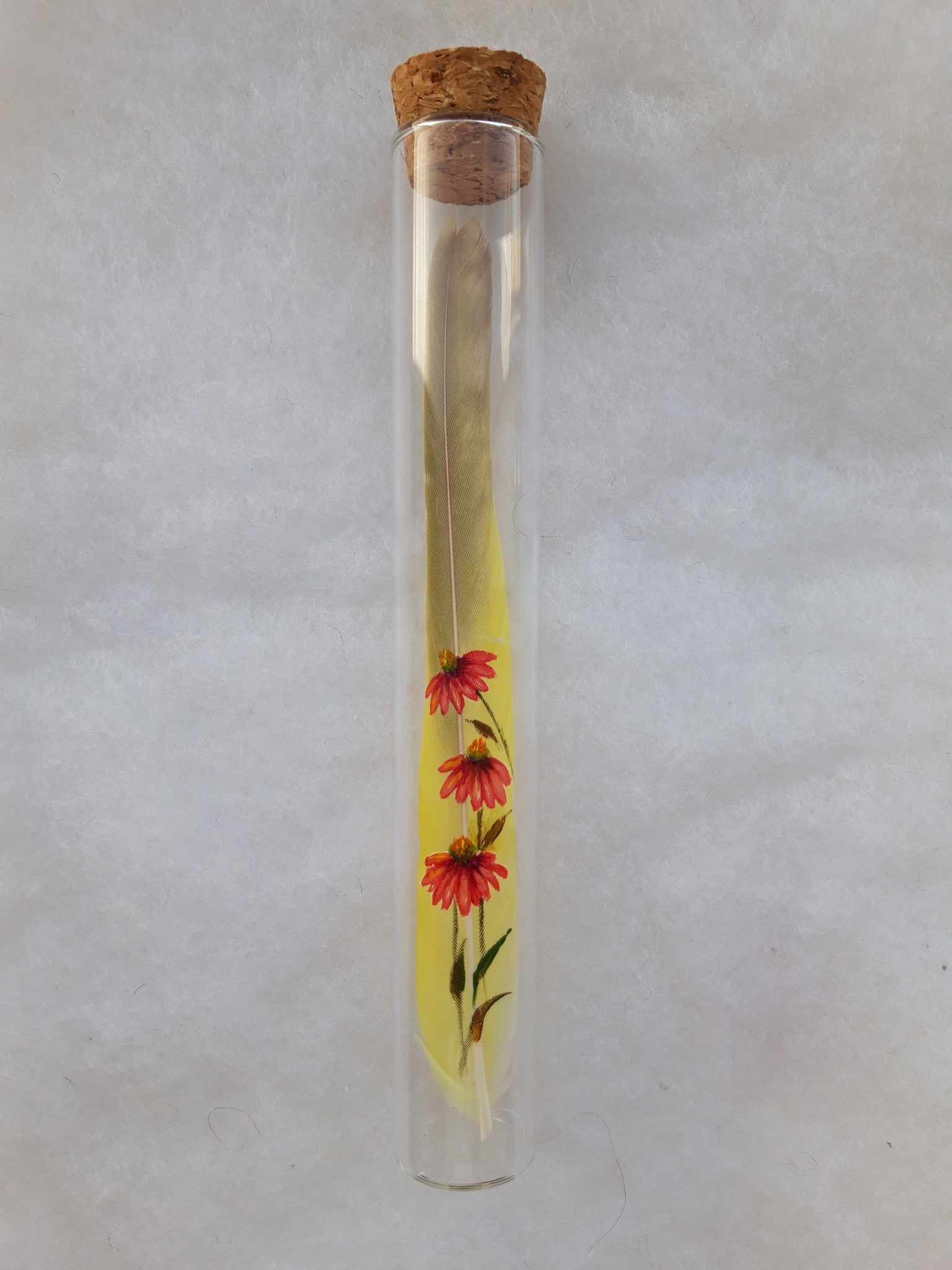 Beschilderde smallen parkiet veer in glazen fles. Afmeting van de fles is c.a. 16cm lang en 2 cm diameter. De prijs is exclusief verzendkosten, die zijn € 8,25 binnen Nederland.