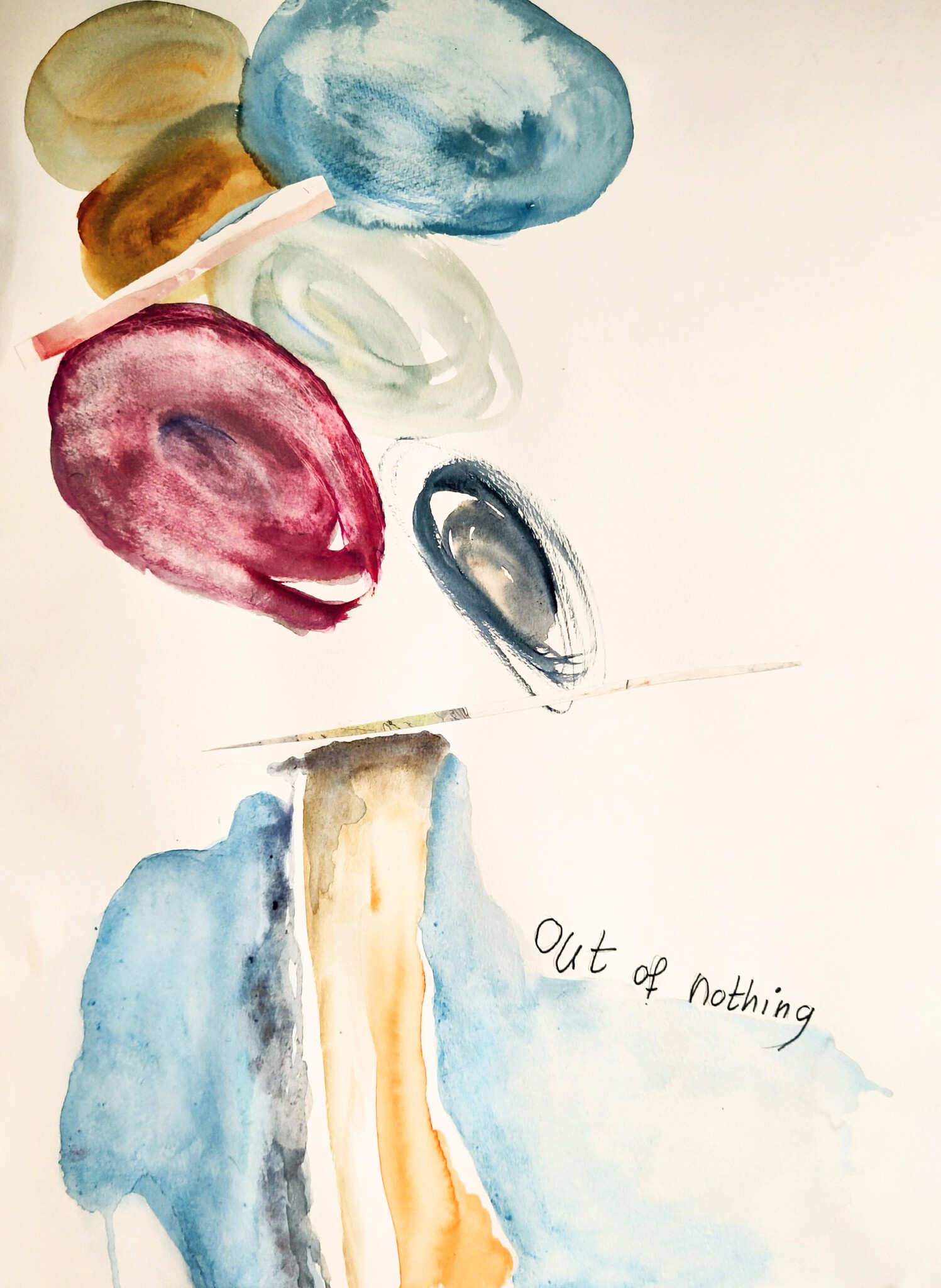 Aquarel vlekken en kleine strook opgeplakt. De tekst komt uit de lucht vallen met de viltstift.